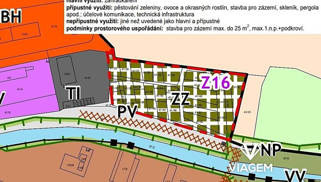 Územní plán předurčuje pozemek pro rekreační zástavbu se specifikací “ZZ - zahrady”. Detaily ohledně dalších možností využití naleznete v přiložených fotografiích či Vám je sdělíme na požádání.