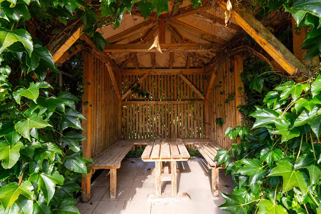 K domu je přilehlá hospodářská, veliká budova a na zahradě zahradní domek k posezení.