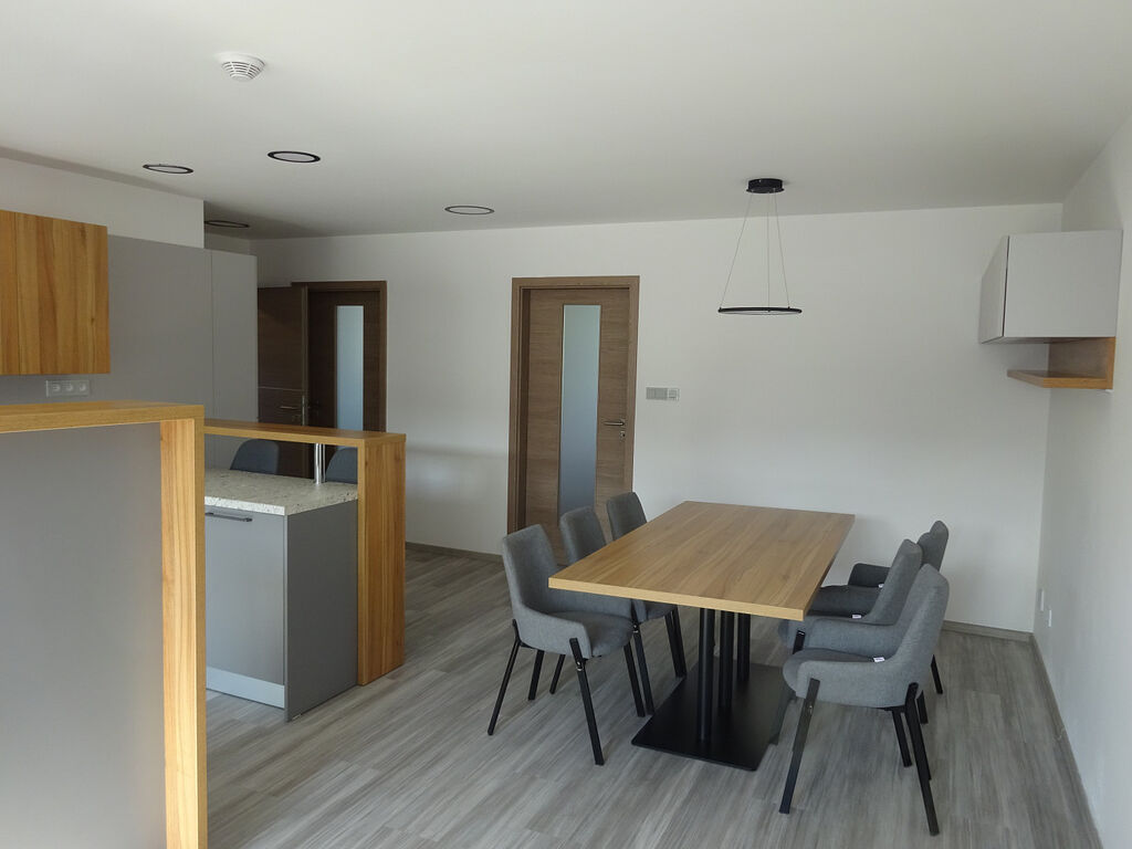 Byt je situovaný v 1. patře budovy v centru obce Stránecká Zhoř (nedaleko obce Měřín, dobrá dostupná vzdálenost do obce Velké Meziříčí, blízkost D1). Chodba s kotlem ústředního topení na zemní plyn; samostatné WC; koupelna; pokoj s kuchyňským koutem včetně všech zařizovacích předmětů, úložných prostor, dvou vestavěných postelí; velký pokoj s kuchyňským koutem včetně zařizovacích předmětů a posezení; dva pokoje; koupelna. Výměra bytu 106,5 m². K dispozici okamžitě. Byt je vhodný pro větší rodinu nebo více přátel. Byt pro nekuřáky a bez domácích mazlíčků. Nájemné ve výši 13tis. Kč, zálohy na energie 5tis. Kč, kauce 13tis. Kč. Průkaz energetické náročnosti budovy nebyl předložen, proto uvádíme energetickou třídu G.