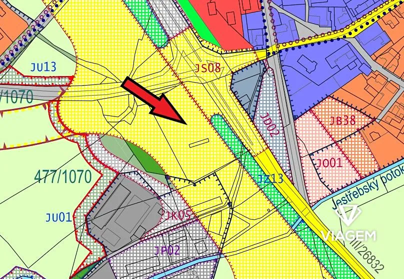 Lokace pozemků se nachází ve středu koridoru pro silnici s mimoúrovňovou křižovatkou, který můžete vidět na přiloženém územním plánu (zaznačeno žlutě). Pozemky podobného typu výhodně vykupuje ŘSD (Ředitelství silnic a dálnic).