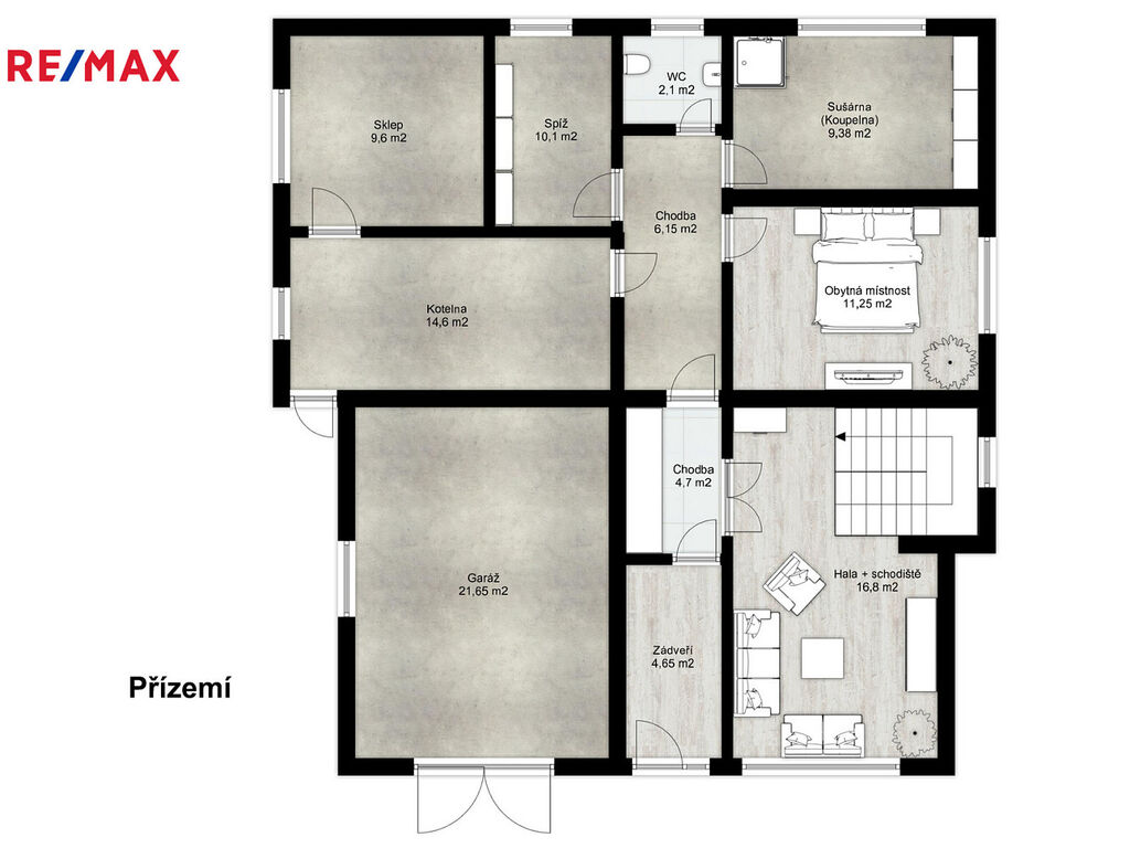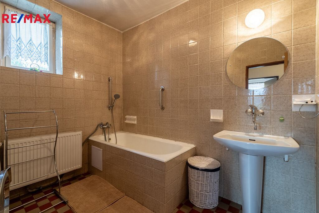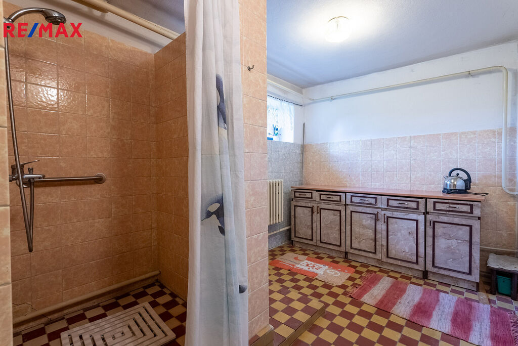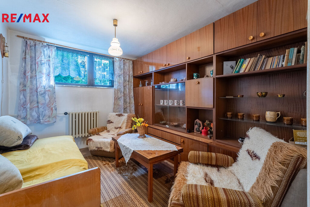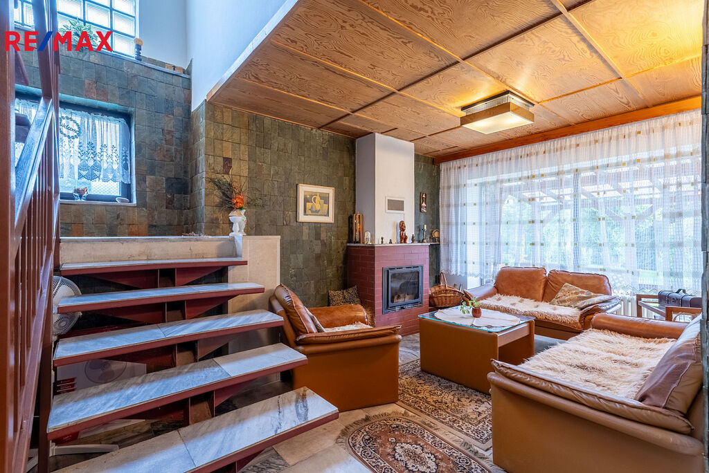 V přízemí domu se nachází stylová místnost s krbem, který vytváří útulnou atmosféru pro rodinná setkání především v sychravých a zimních měsících. Dále je zde jedna menší obytná místnost, kterou lze využít jako pracovnu, koupelna se sprchovým koutem, toaleta a několik technických místností, které sloužily jako sklepy a mají potenciál pro přestavbu na další obytné prostory. Součástí domu je rovněž prostorná garáž.