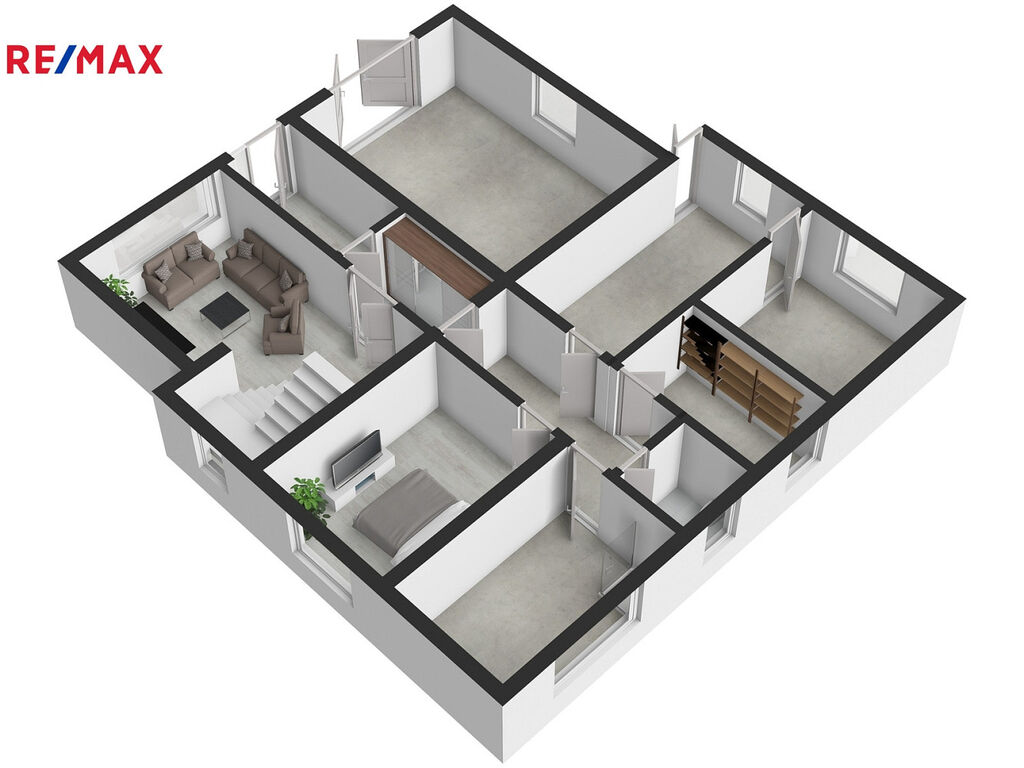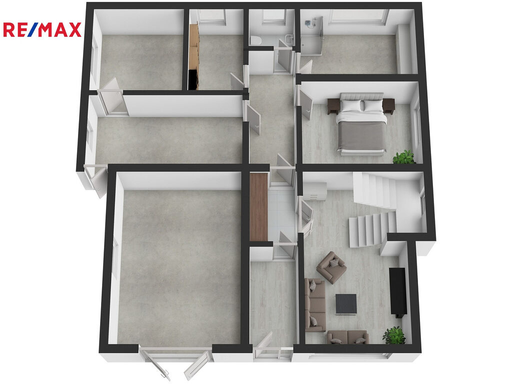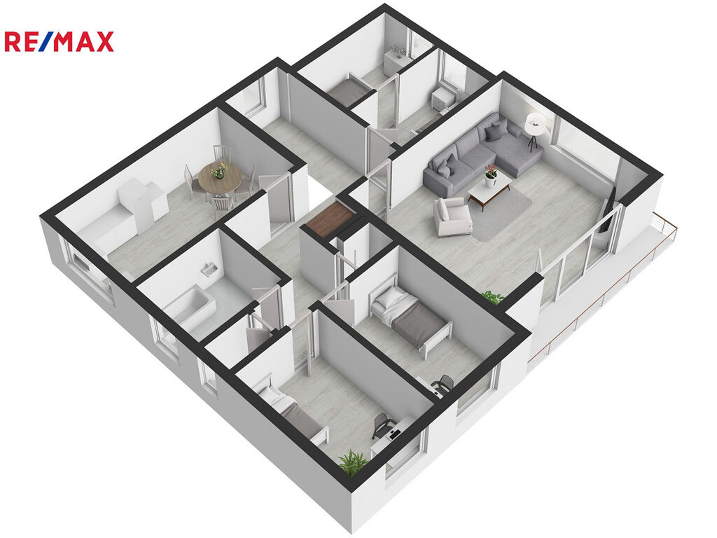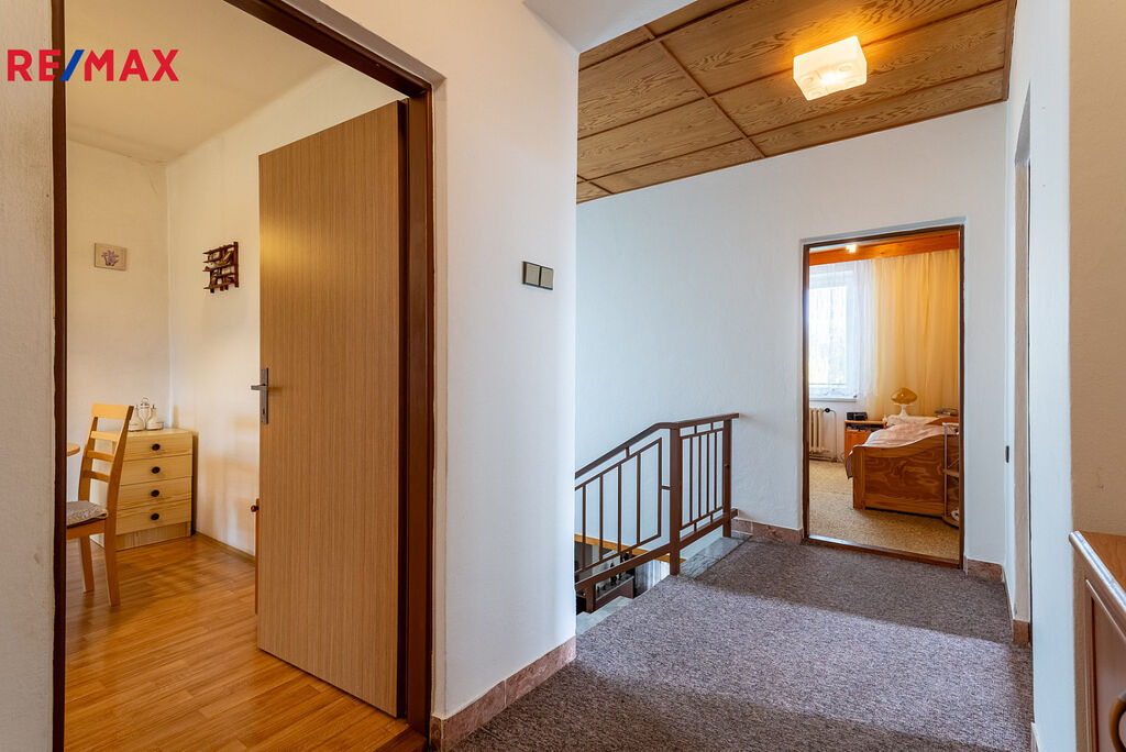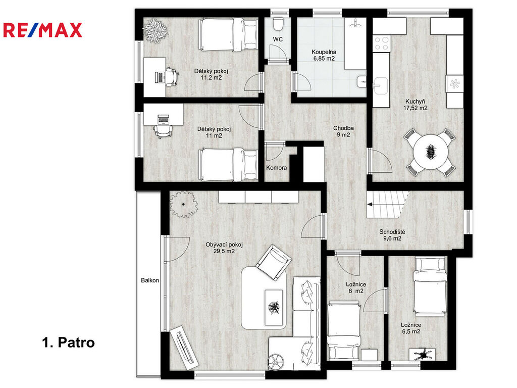 V 1. patře se nachází bytová jednotka s prostorným obývacím pokojem s balkónem, velkou kuchyní, 4 menšími místnostmi (ložnicí, dětskými pokoji) a koupelnou.