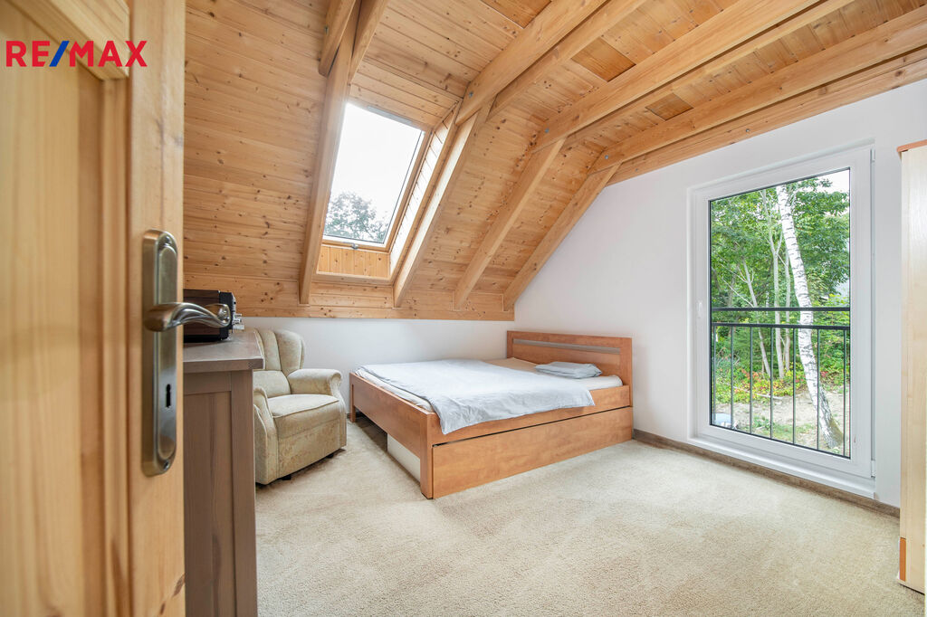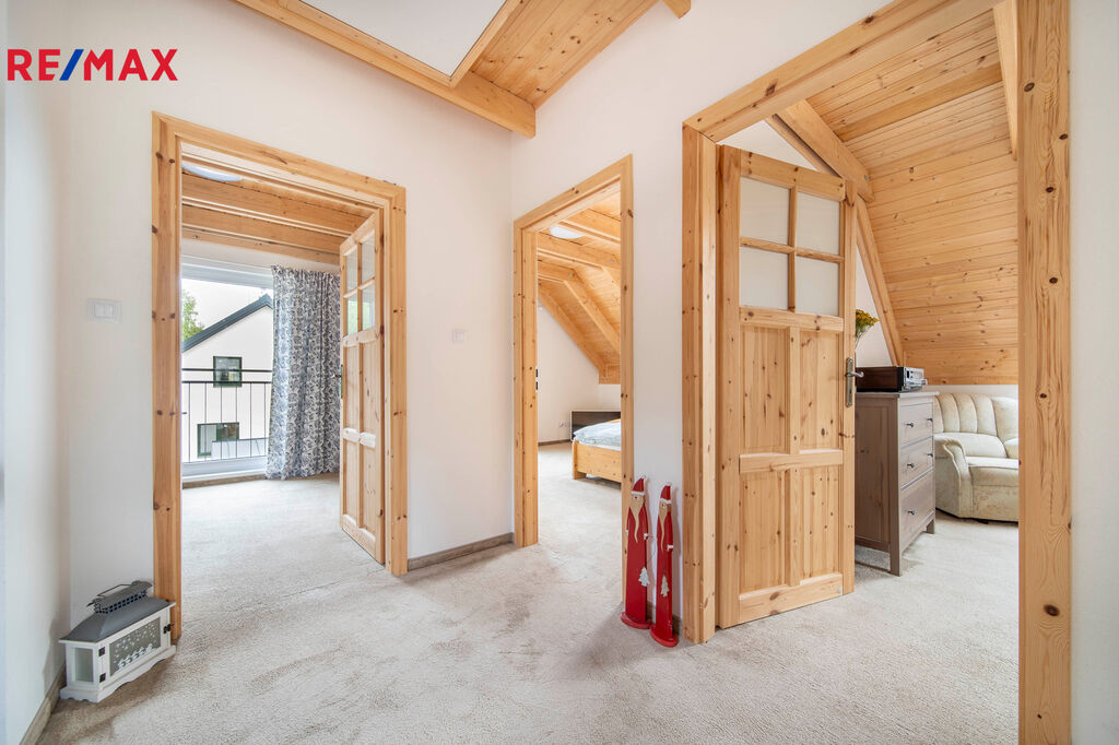 * **Dispozice 4+kk** – vzdušný obývací prostor s krbem a kuchyňským koutem, tři útulné ložnice v patře, dvě koupelny