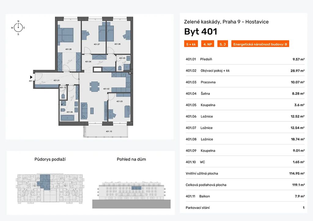 Exkluzivně nabízíme k prodeji byt 5+kk o podlahové ploše 119 m², který se nachází ve 4. podlaží rezidence Zelené kaskády. Tento byt nabízí moderní bydlení v jedné z nejžádanějších lokalit Prahy 9 – Hostavice, která spojuje klid přírody a pohodlí městského života.