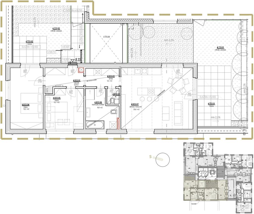 Nabízíme k prodeji exluzivní byt s bezkonkurenčními výhledy. Jedná se o byt B33 o dispozici 3+kk a celkové výměře 89,1 m² dle NOZ (čistá užitná plocha 85,9 m²). Byt se nachází ve 4. podlaží a je orientován na všechny světové strany. Jedná se o unikátní byt/dům postavený na střeše bytového domu. K bytu náleží dvě terasy, předzahrádka a samozřejmě sklepní kóje přímo na patře o velikosti 2,8 m². Cena zahrnuje i parkovací stání – vše je uvedeno včetně DPH.