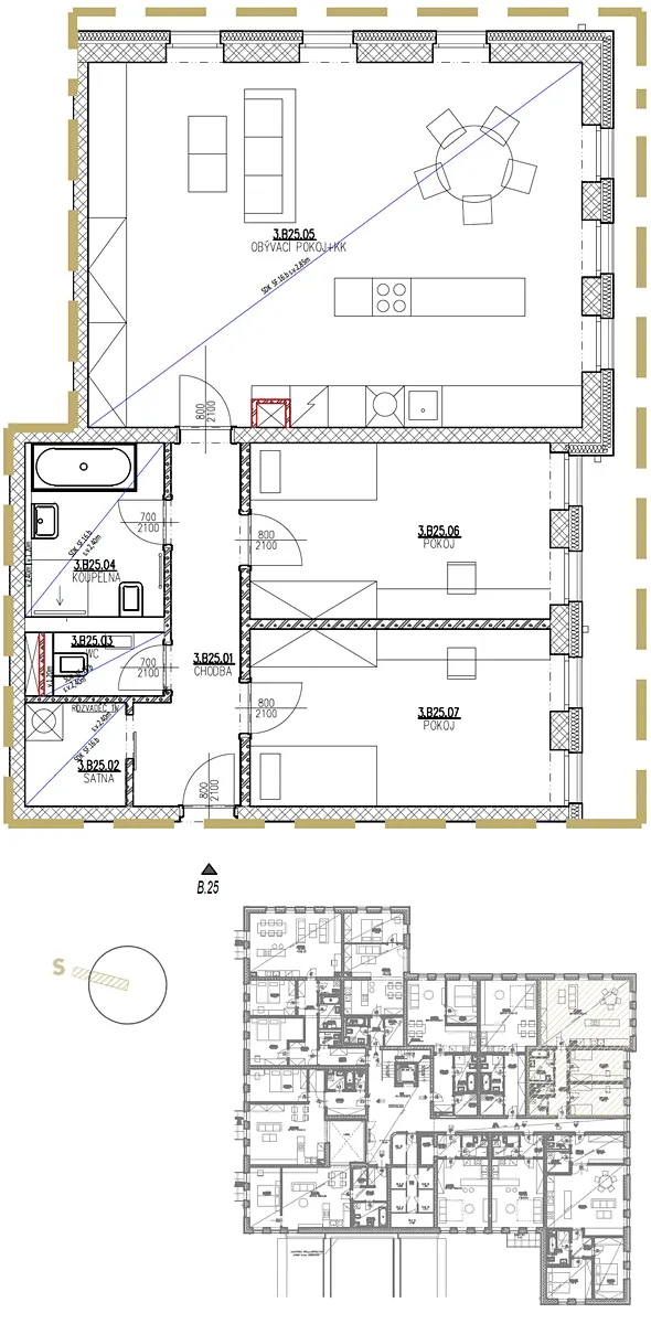 Nabízíme k prodeji nadstandardní byt B25 o dispozici 3+kk a celkové výměře 95,2 m² dle NOZ (čistá užitná plocha 90,9 m²). Byt se nachází ve 3. podlaží a je orientován převážně na jihovýchod. K bytu náleží sklepní kóje o velikosti 2,1 m². Cena zahrnuje i parkovací stání – vše je uvedeno včetně DPH.
