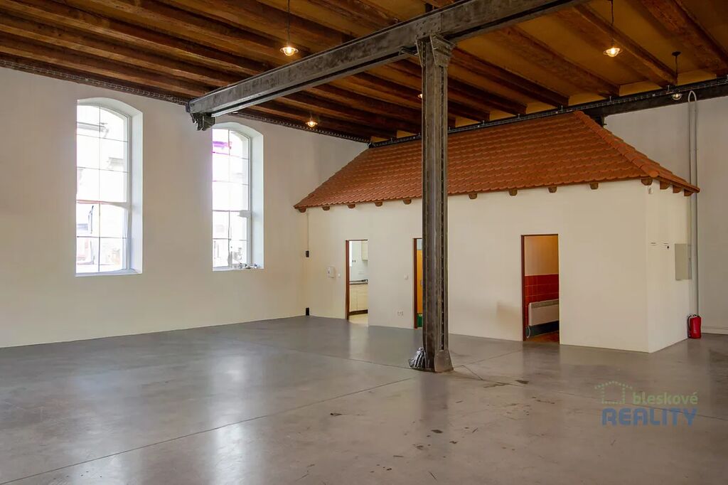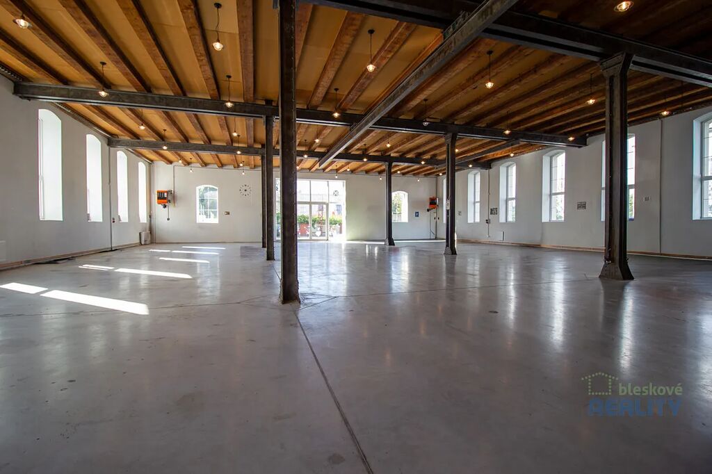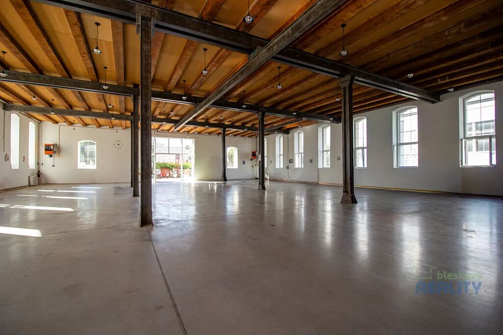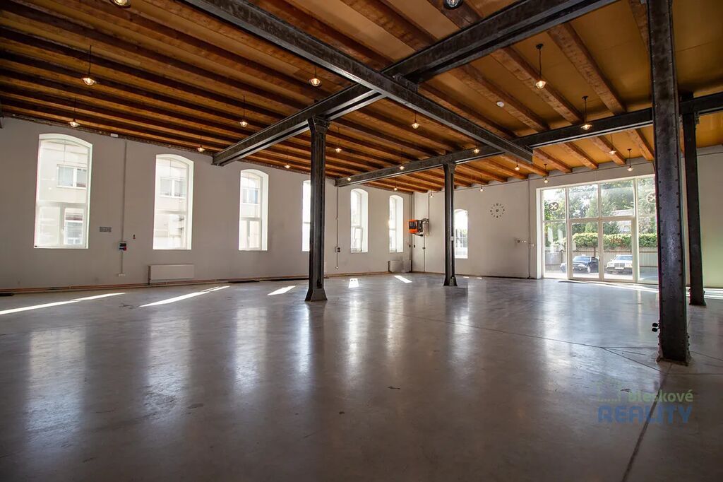 -vysoké stropy, ocelová konstrukce, velká okna s přirozeným světlem