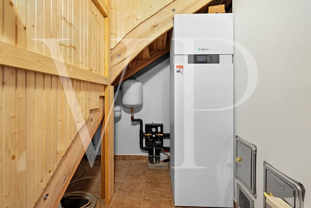 Dům je napojený na obecní vodu. Odpady jsou svedené do moderního septiku s pískovým filtrem (bez vyvážení) a o teplo a ohřev vody se postará zemní tepelné čerpadlo a plynový kondenzační kotel. Druhým, přírodním zdrojem tepla jsou tradiční kachlová kamna s pecí a vyměníkem. Po celém přízemí je rozvedené podlahové topení a v pokojích jsou umístěné radiátory.