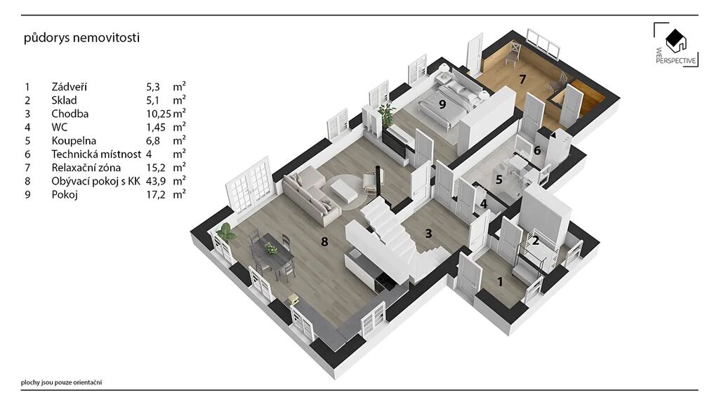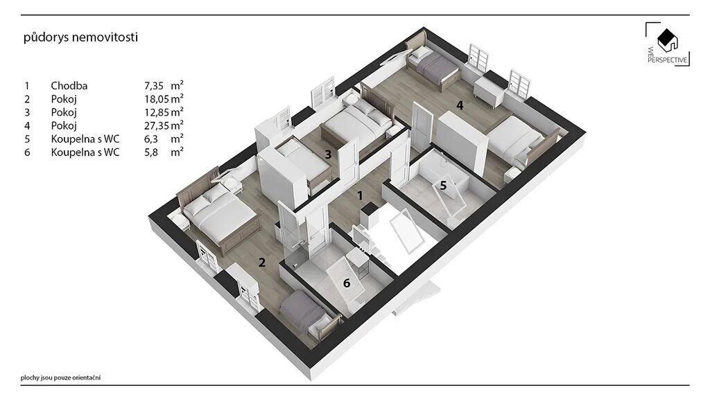 V patře se dále nachází 3 útulné světlé ložnice, dvě koupelny a prostor pod střechou vhodný například pro pracovnu a nebo dětskou ložnici s celkovou podlahovou plochou cca 78 m².