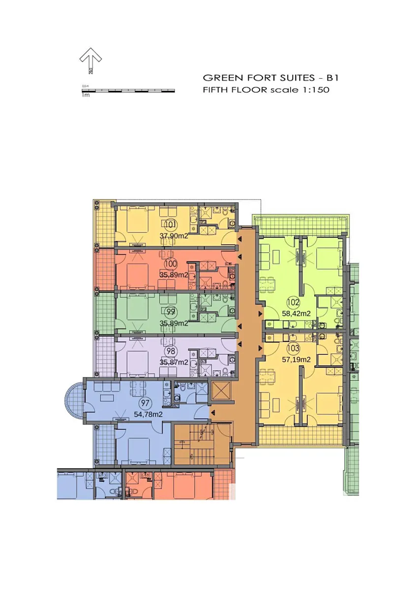 Nabízíme k prodeji komfortní apartmán o dispozici 2+kk s podlahovou plochou 63,41 m², umístěný v 5. podlaží z 6 v moderním rezidenčním komplexu Green Fort Suites společnosti Fort Knox.