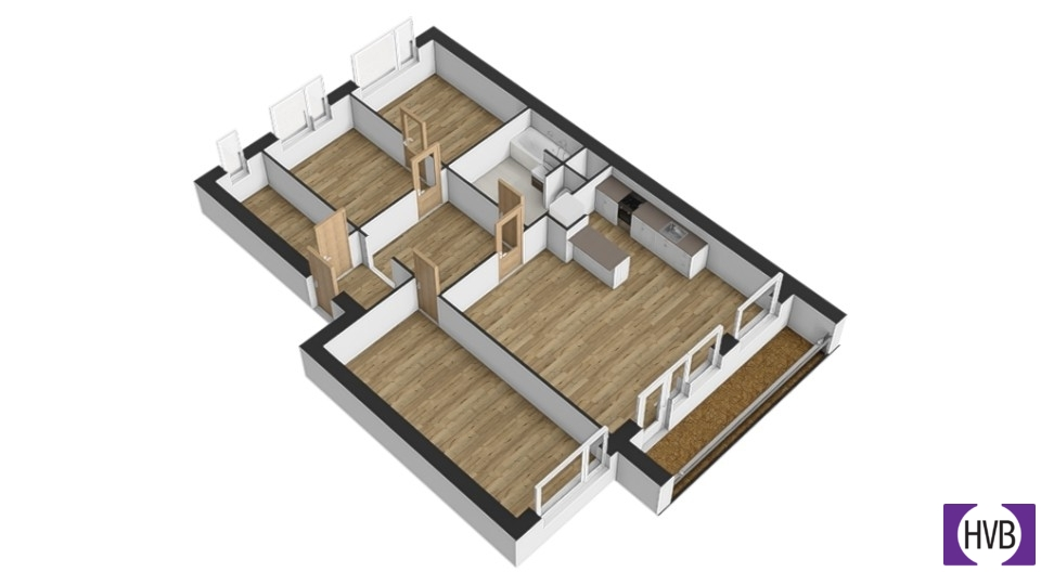 Dispozice nabízí prostorný obývací pokoj s moderně zařízenou kuchyní a jídelním koutem, 3 pokoje, koupelnu s WC, předsíň, komoru a lodžii.