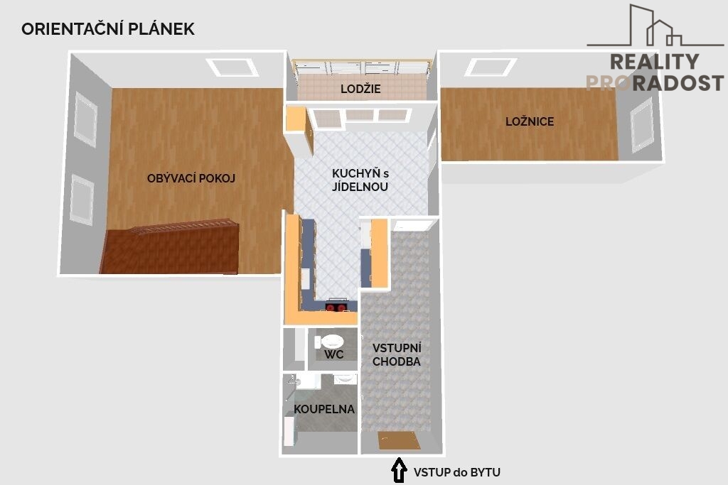 Byt je velice dobře dispozičně řešen – z prostorné vstupní chodby je vlevo vstup do koupelny se sprchovým koutem, umývadlem a pračkou, dále vstup na samostatné WC a přímo proti vchodu se vchází do hlavní obytné části bytu – kuchyně s jídelnou propojenou s obývacím pokojem. Z jídelny je vstup na lodžii a do ložnice, z obývacího pokoje je po dřevěném schodišti přístup do druhého podlaží mezonetového bytu. Zde jsou z chodby přístupné 3 neprůchozí pokoje a koupelna s vanou, dvěma umývadly a s WC (vše viz orientační plánek).