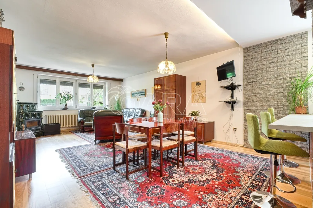V 1.NP je byt 2+1 (cca 46 m²) a navazuje mezonetový byt 6+kk: dole prostorný obývací pokoj s krbovými kamny, kuchyně, komora a WC, v 2.NP 5 pokojů, koupelna, WC a balkón.