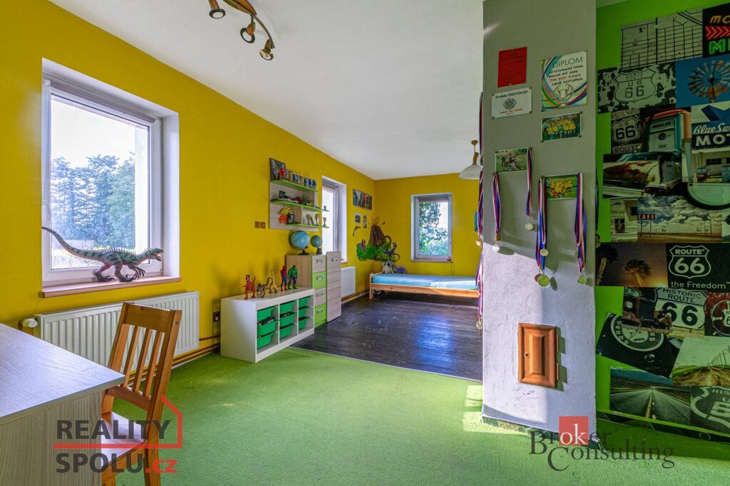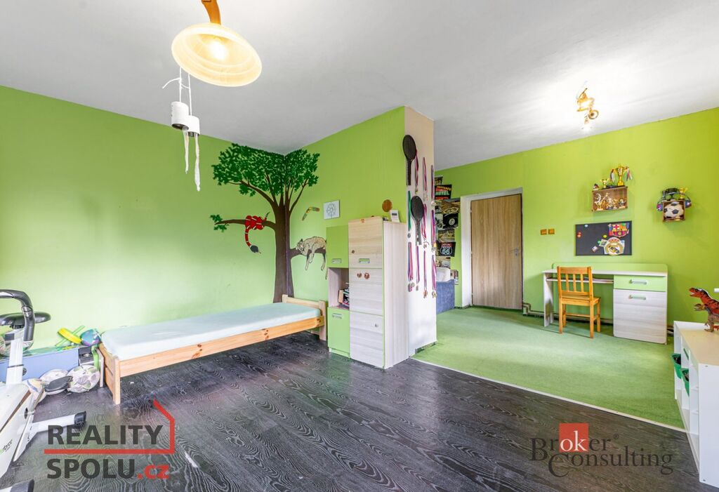 • Patro: ložnice s kuchyňskou linkou (dříve samostatná bytová jednotka), druhá koupelna s vanou a toaletou a pokoj využívaný jako dílna.
