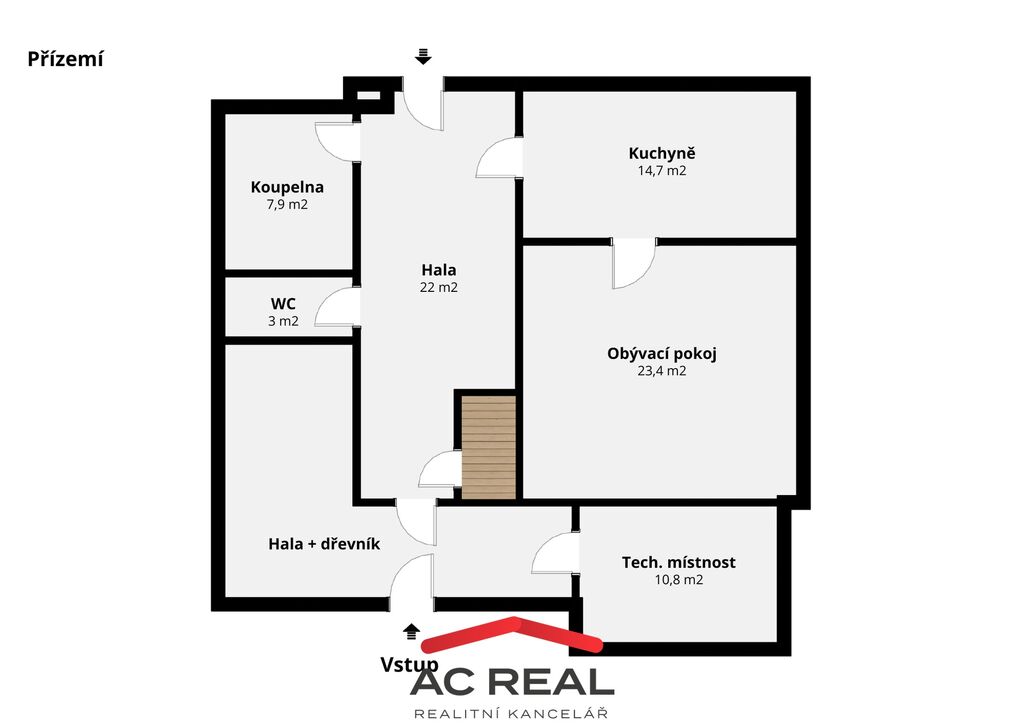 Dispozice a vybavení: Chalupa nabízí dvě obytná patra s celkovou užitnou plochou 187 m². Vstupní veranda s praktickým dřevníkem vede do prostorné haly. Po levé straně se nachází samostatné WC a vstup do velké koupelny, vpravo je kuchyně s původními kachlovými kamny, která navazuje na obývací pokoj s krbovými kamny a schodiště do horního patra. V patře je otevřený prostor společné ložnice o velikosti 69 m². Hala, koupelna i WC jsou vybaveny podlahovým vytápěním.