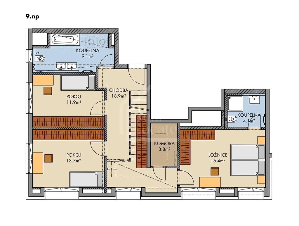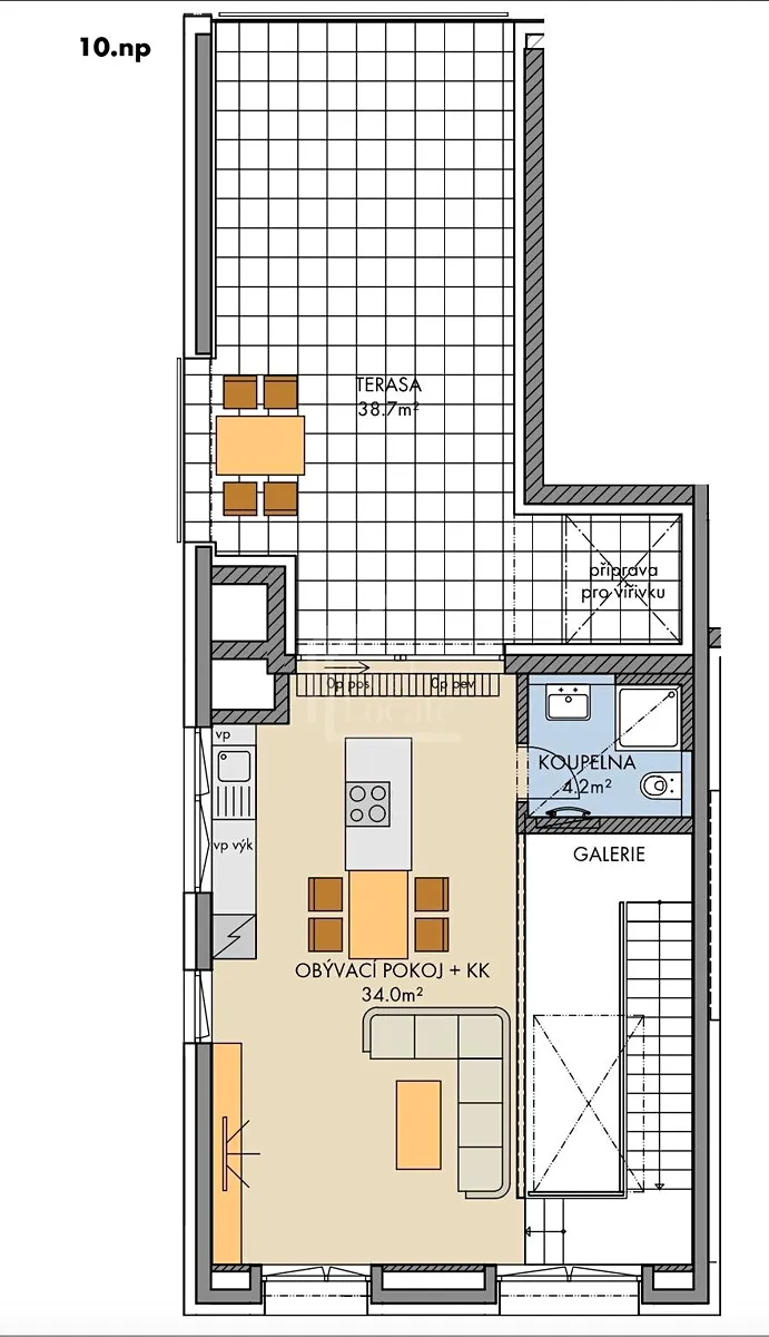 Mezonet o celkové ploše 120 m² nabízí komfortní a praktické bydlení s dostatkem soukromí a nachází se v 9. a 10. nadzemním podlaží s orientací na jih, západ a sever.