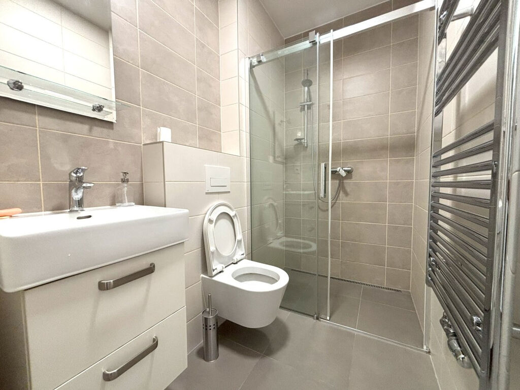 V koupelně je sprchový kout a umyvadlo umyvadlovou skříňkou, osvětlené zrcadlo a tepelný žebřík.