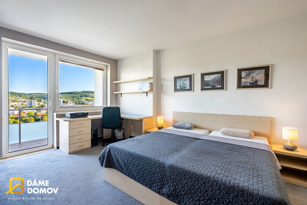 Čtyři ložnice, šatna, prostorná koupelna a terasa se stejným výhledem i rozměry jako v horním patře.