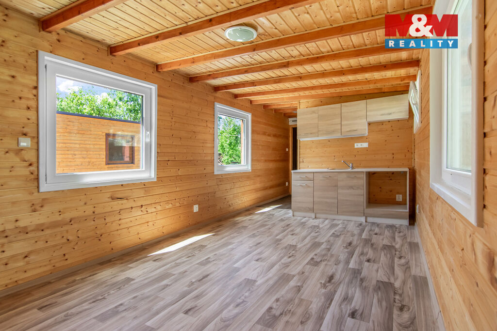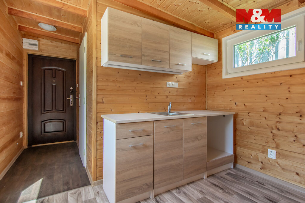 Prodej mobilheimu s dispozicí 1+kk: užitná plocha 23 m2, objem 54 m3 (celkový vnitřní užitný prostor), konstrukci tvoří ocelová základová deska, KVH hranoly 240mm a 120mm, OSB opláštění a palubky (severský smrk), zateplení 12 cm minerální vata, polyuretan - špičkové termoizolační vlastnosti. Vytápění zajišťuje podlahové topení v koupelně a příprava na elektrické přímotopy. Podlahu tvoří dlažba v koupelně, PVC v obytné části a na chodbičce. Kompletní elektroinstalace a vodoinstalace (bojler, dřez, sprchový kout, WC, umyvadlo, příprava na pračku). Samozřejmostí je ošetření proti vlhkosti, houbám a plísním.
