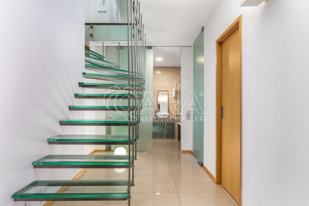 Do druhého podlaží vede na míru vyrobené skleněné schodiště Glaverbel. V prostorném obývacím pokoji s