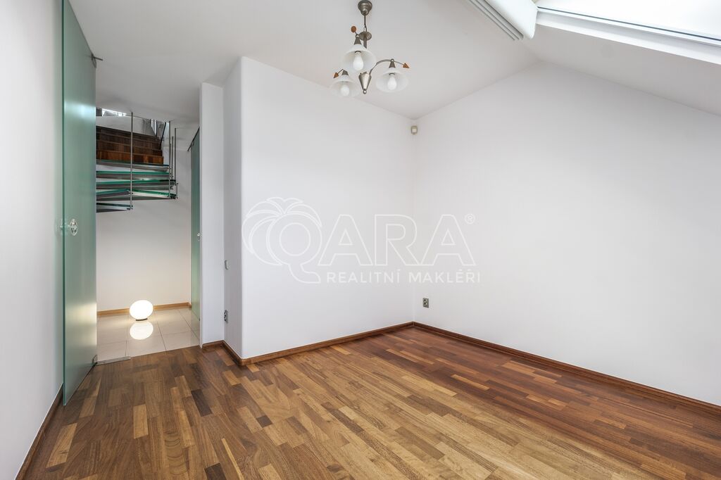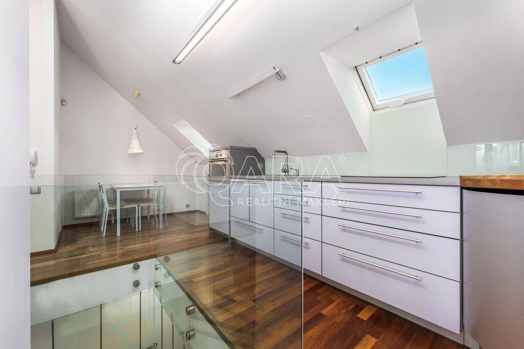 Tento designový byt se nachází v pátém a šestém podlaží udržovaného secesního domu s výtahem. Nadčasový interiér je řešen s důrazem na kvalitu a design. Ve spodním podlaží se nachází dvě ložnice s atypickými skleněnými dveřmi a roletami Maroon. V obou pokojích jsou kvalitní podlahy z exotického dřeva. Mezi oběma ložnicemi je uzavíratelná prostorná šatna s policovým a závěsným systémem vyrobeným na zakázku. Za