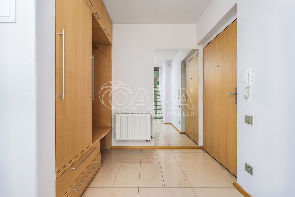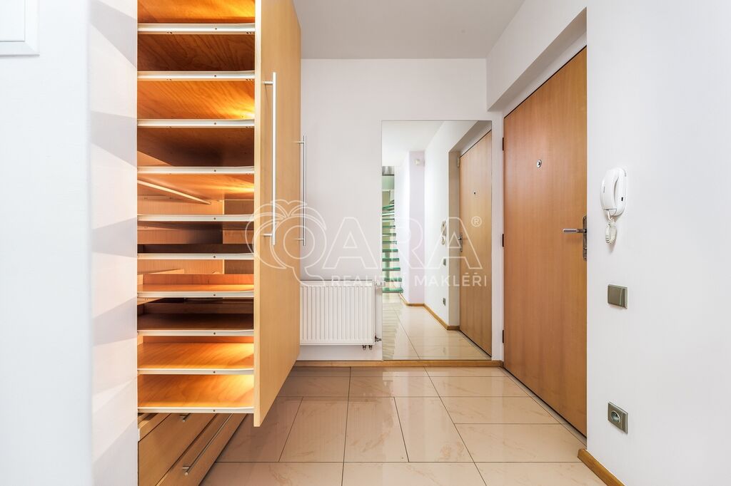 dispozici také klimatizace LG, která chladí i vytápí. Přes francouzské okno s kvalitními trojitými skly se vstupuje na prostornou terasu z teakového dřeva s malým dodatečným úložným prostorem. Orientace terasy je ideální - jihozápad. Bezpečnostní roleta, alarm v celém bytě, bezpečnostní vstupní dveře.