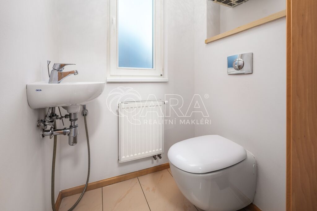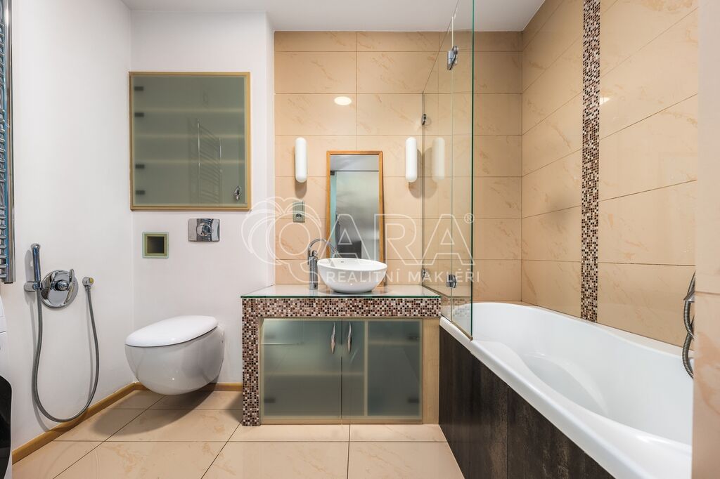 prosklenými posuvnými dveřmi je útulná koupelna s vanou a sprchovou zástěnou, toaletou, umyvadlem se skříňkou, pračkou, otopným žebříkem a podlahovým vytápěním. Osvětlení Artemide a designové baterie. V prostorné chodbě je vestavěná skříň s osvětleným botníkem.