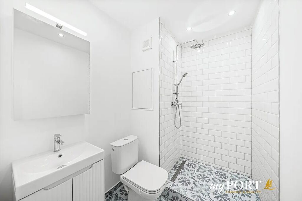• Moderní koupelna s WC, sprchovým koutem, koupelnovou skříňkou, umyvadlem a zrcadlem