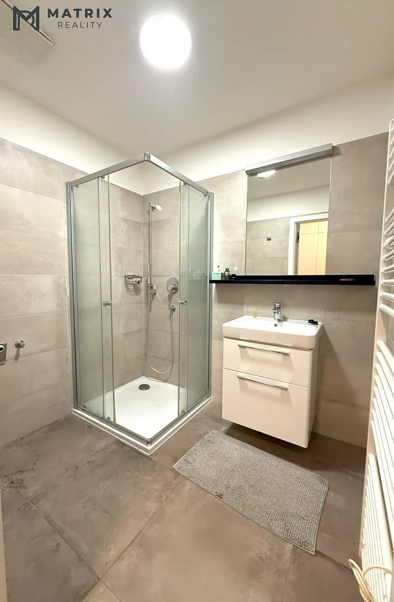 Hledáte bydlení v novostavbě, blízko parku a cyklostezky, metro do 5 minut chůze a veškerá občanská vybavenost v blízkosti , pak máme pro Vás do nabídky tento byt v Rezidenci U Rokytky. Byt je dispozičně řešený jako 2+kk - spací kout o velikosti 57,4 m2 a balkón 4,38 m2 v 1.NP . Velká vstupní chodba s vest. skříněmi, prostorná šatna , velký obývací pokoj s kuchyňským koutem. Kuchyňská linka s vest. spotřebiči - el. varná deska, el. trouba, myčka, lednice. Velký spací kout pro manželskou postel 2x2 m2 a skříně. Koupelna se sprchovým koutem , samostatné WC. Celá rezidence je max. bezpečná, všude vstup pomocí čipu. K pronájmu parkovací stání za 2.000,- Kč + DPH 21%. Byt je k nastěhování ihned.Neváhejte si domluvit prohlídku.