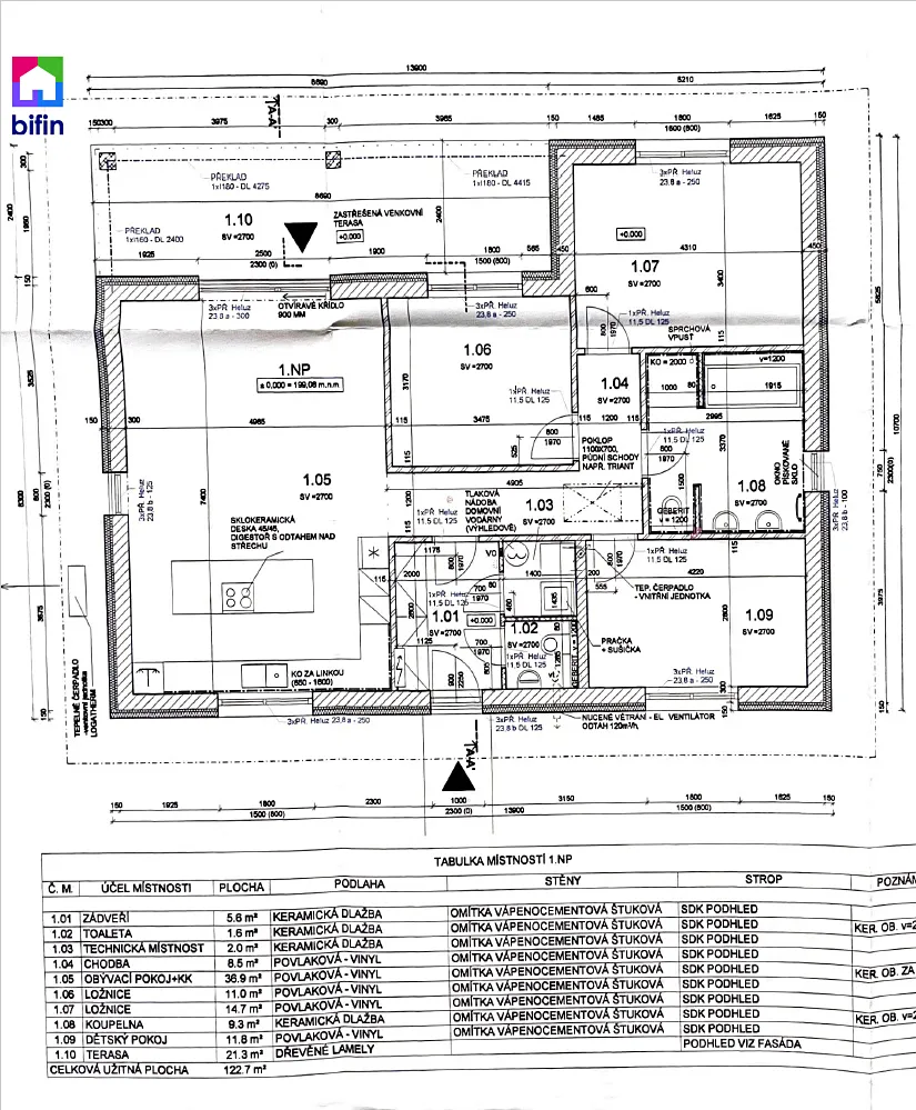 Vytápění domu zajišťuje elektrický kotel zn. Vaillant - Protherm, na který je napojeno podlahové topení zn. Rehau. Dům lze vytápět také tepelným čerpadlem, příprava pro napojení na tepelné čerpadlo (vzduch-voda) je připravena. Teplá voda je zajištěna elektrickým kotlem se zásobníkem na teplou vodu. V technické místnosti se nachází bateriové úložiště k FVE panelům, a je zhotovena i příprava pro pračku a sušičku.