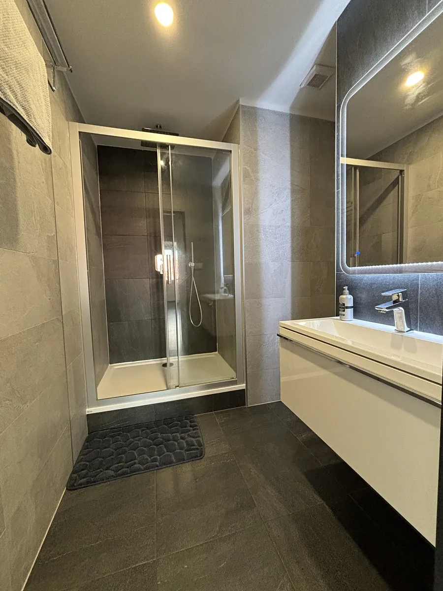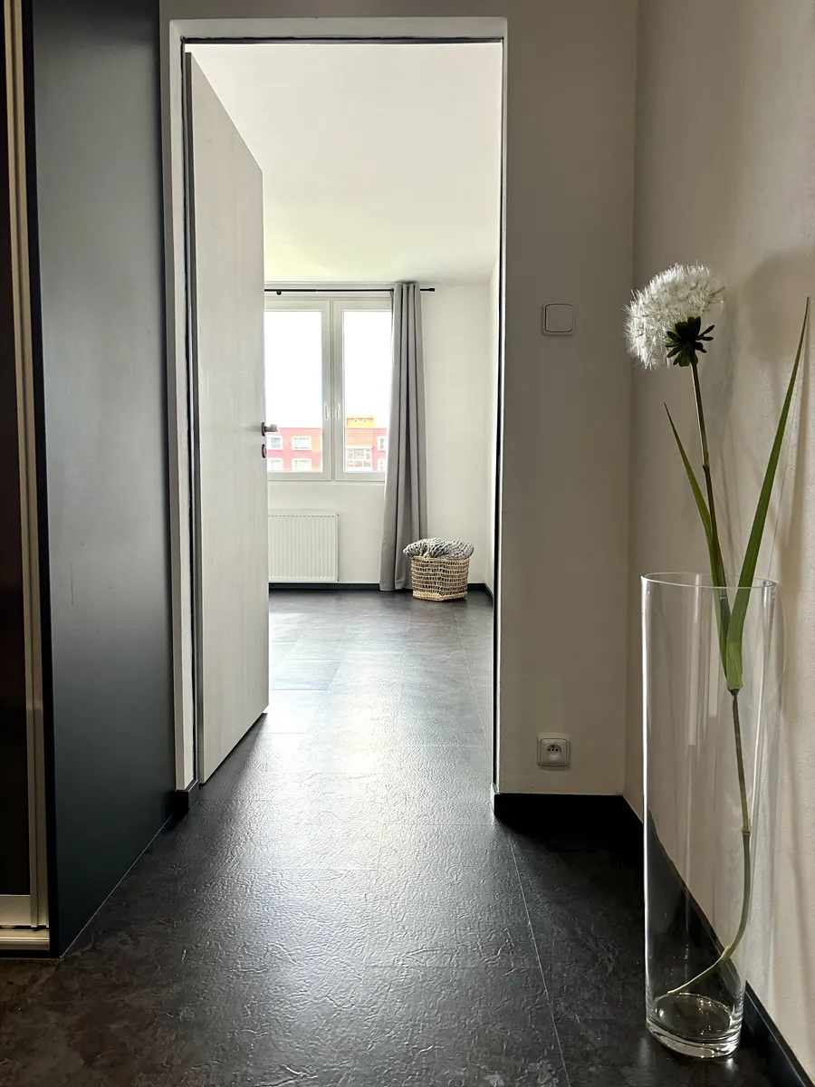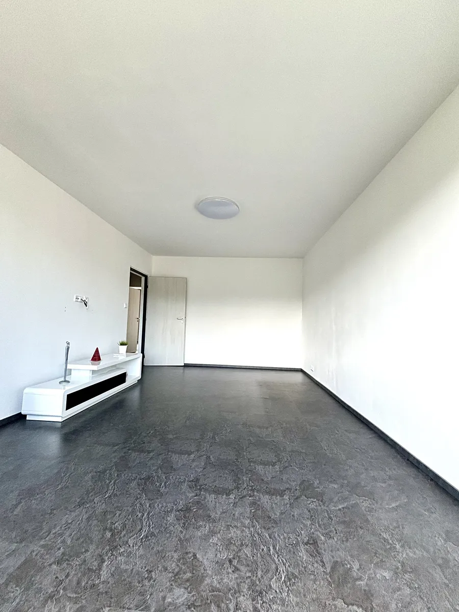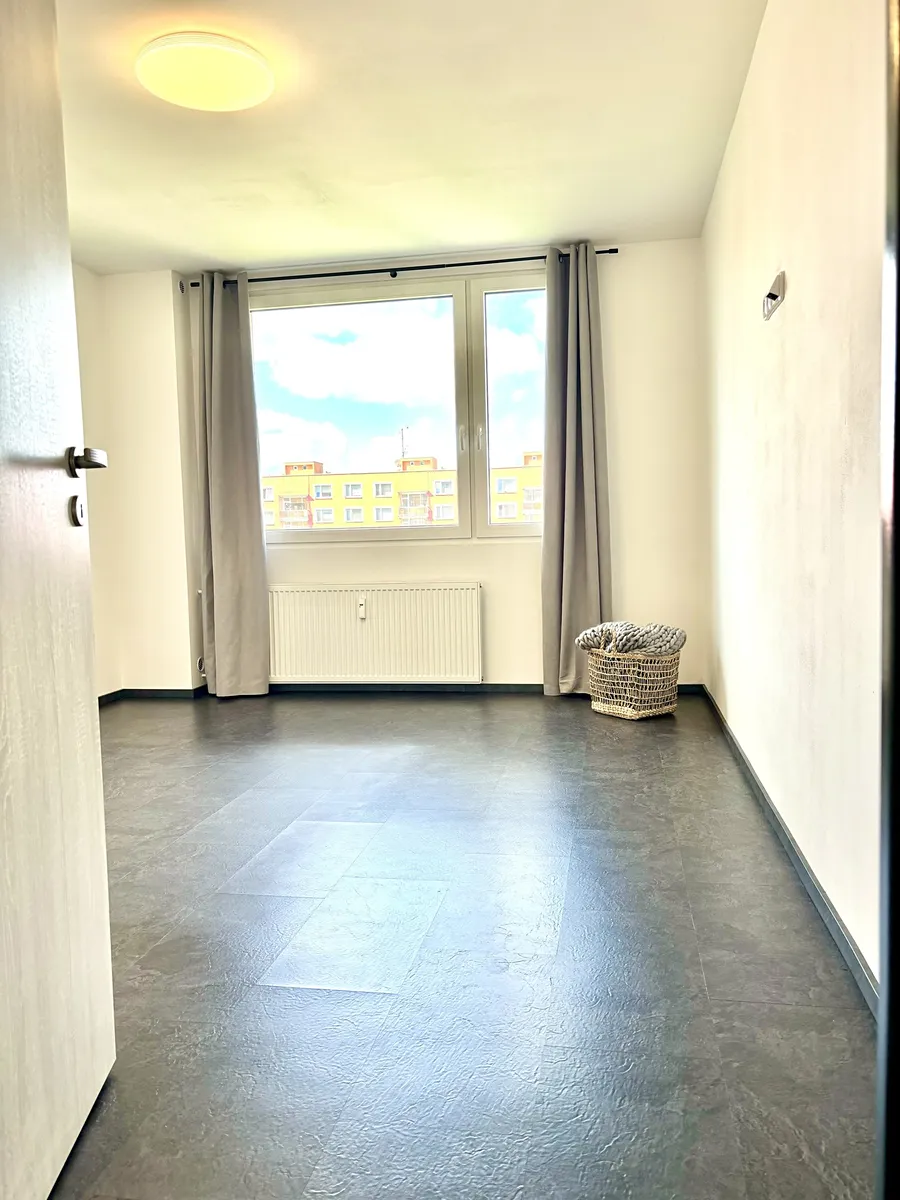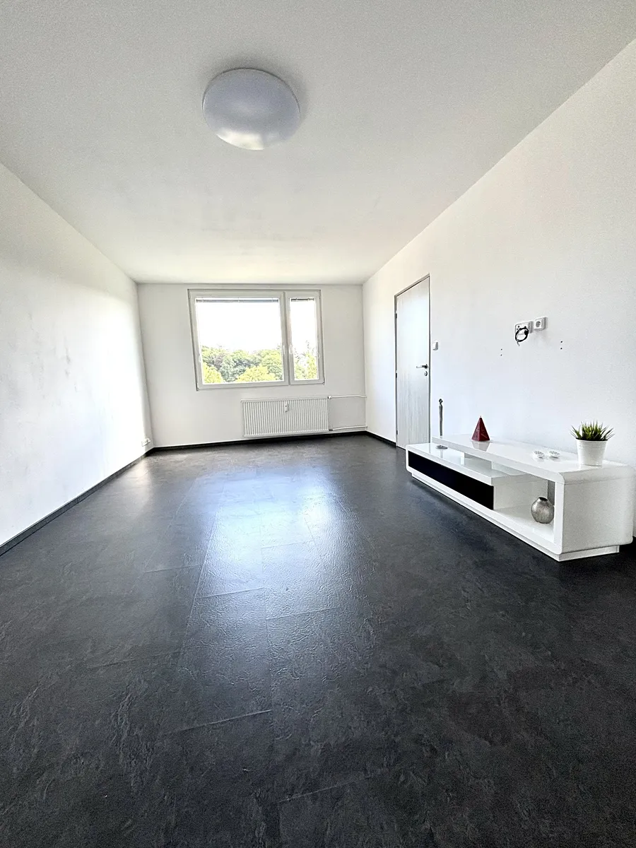 Dispozice bytu: kuchyň s novou kuchyňskou linku s vestnými spotřebiči (myčka, lednice, varná deska, trouba) s jídelním stolem + židle, velký obývací pokoj, samostatný pokoj se šatní skříní, zděná prostorná koupelna se sprchovým koutem, samostatné WC a větší předsíň s vestavnou skříní.