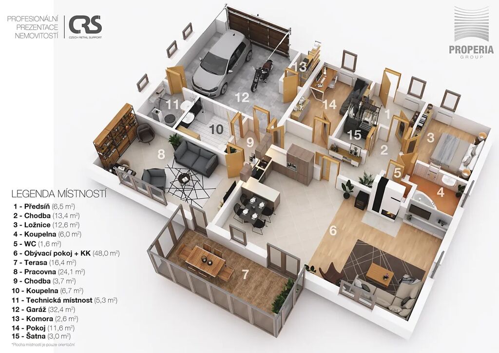 - prostorná dvojgaráž (cca 33 m²) s místem pro dva automobily i motorku, plus další parkovací místa přímo na pozemku.
