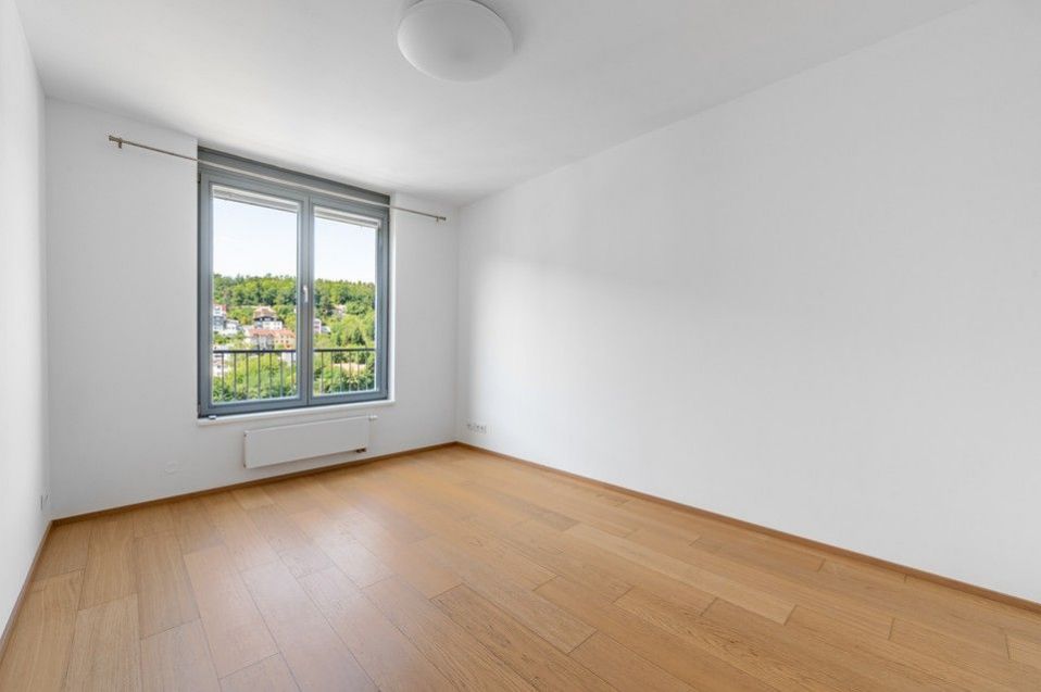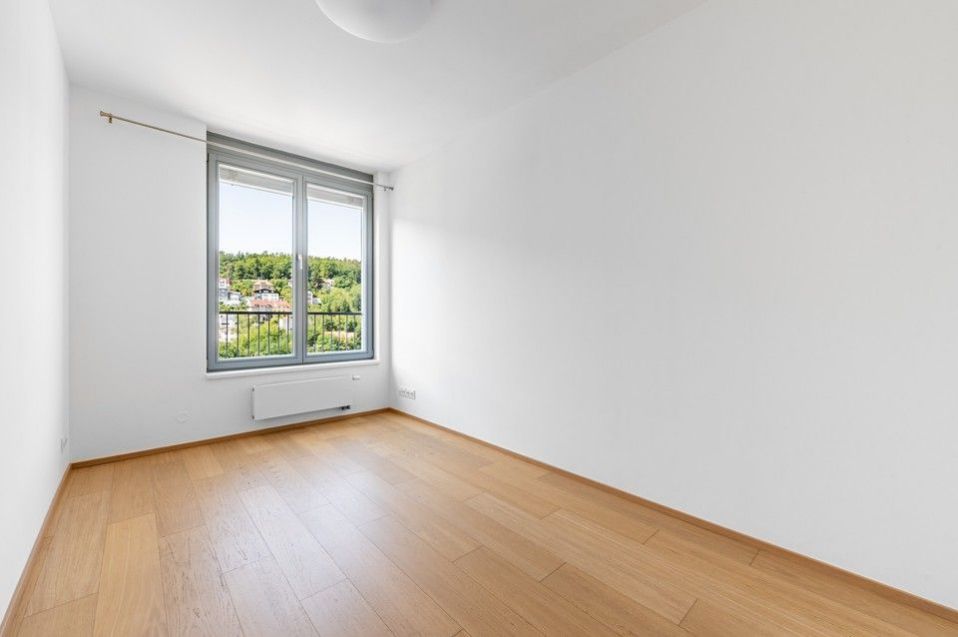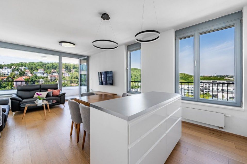 Pronájem slunného, moderního, jihozápadně orientovaného, kompletně vybaveného, klimatizovaného bytu 4+kk (109m2) s krásnými protilehlými výhledy do okolní zeleně, se dvěma balkony (9,8m2) a parkovacím místem v ceně nájmu v 8.podlaží prestižní nízkoenergetické (A) bytové rezidenci Waltrovka s nízkými provozními náklady, umístěné na Praze 5, v pěší dostupnosti stanice metra Jinonice (linka B) a oblíbeného parku Cibulka.