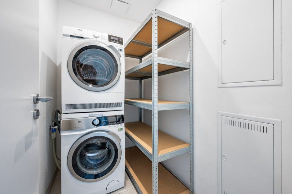 Nadstandartní vybavení zahrnuje kuchyňskou linku v bílém designu (myčka, lednice, mrazák, trouba, mikrovlnná trouba, indukční deska, podlahy z masivu, jídelní stůl, 6 čalouněných židlí, kožená sedací souprava, konferenční stolek, velkoplošná televize a skříňka pod televizi, vybavená ložnice - manželská postel, prostorná šatní skříń s posuvnými dveřmi, stropní osvětlení v celém bytě, pračka a sušička, dostatek úložných prostor - šatní skříně v chodbě.