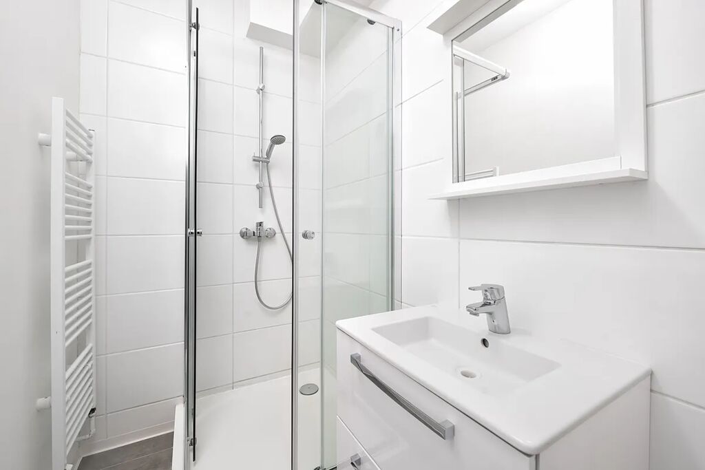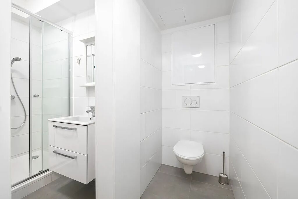Prostorná vstupní chodba s kuchyňkou, pokoj se sprchou a umyvadlem, WC zvlášť.