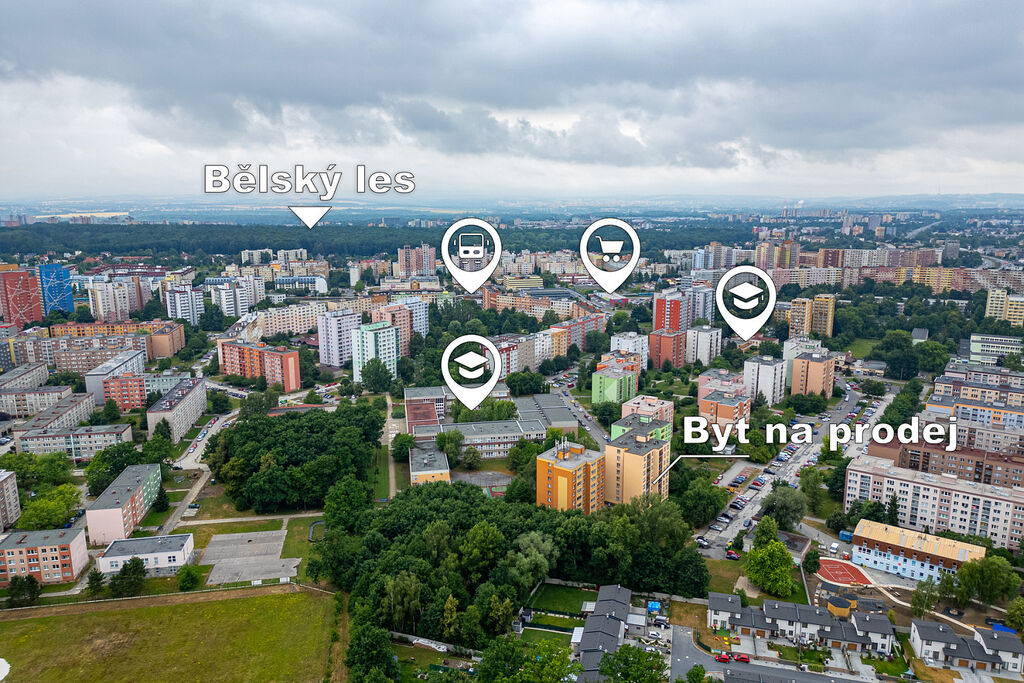 Lokalita je jedním z hlavních benefitů tohoto bydlení – lokalita je zasazena do zeleně, hned za domem se rozprostírá Bělský les, ideální na procházky, běhání i víkendové výlety s dětmi. Škola, školka i hřiště jsou doslova za rohem, cyklostezky, sportovní hala, zdravotní středisko i nákupní možnosti také v docházkové vzdálenosti. Zkrátka místo, kde máte vše důležité na pár minut.