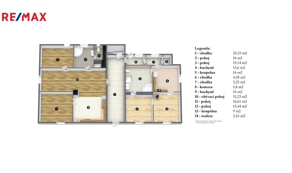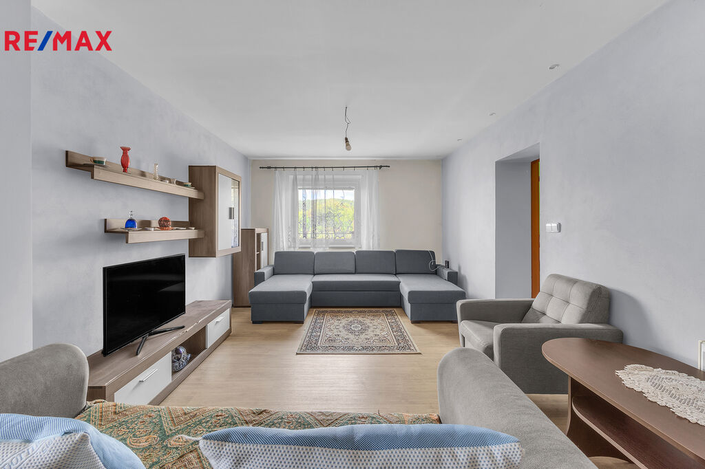 3+kk (113 m²): obývací pokoj spojený s kuchyní, ložnice, dětský pokoj, koupelna a samostatné WC.