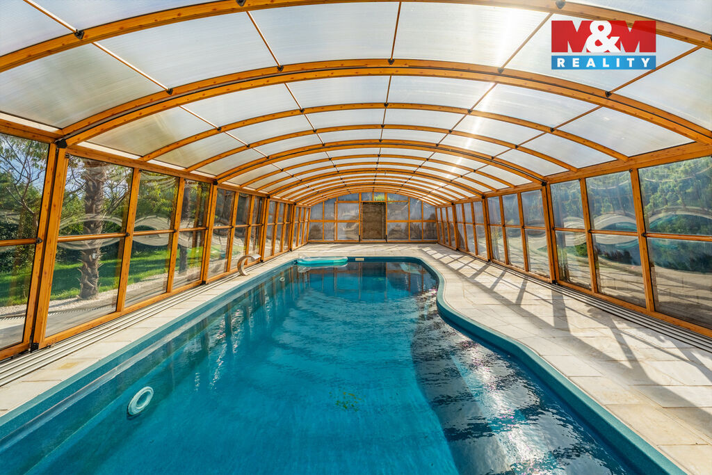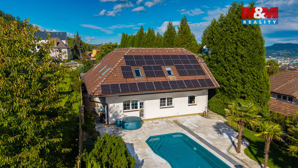 K prodeji nabízíme výjimečný rodinný dům 5+1 v Děčíně, ul. Veveří – část Václavov, který osloví náročné zájemce hledající nadstandardní bydlení s maximálním soukromím. Dům nabízí velkorysý obytný prostor s důrazem na komfort a moderní technologie. Krytý bazén 10×4 m lze díky tepelnému čerpadlu a hliníkovému zastřešení využívat celoročně, zadní terasa je osazena elektrickými roletami s LED podsvícením. V přízemí se nachází prostorný obývací pokoj s jídelnou a kuchyní se spotřebiči značek Siemens a Miele, pracovna a koupelna s designovou vanou z litého černého mramoru a sprchovým koutem EAGO. Podlahy z přírodního kamene jsou zde vyhřívané. V patře jsou tři pokoje, další komfortní koupelna se sprchou a klimatizace, která zajišťuje pohodlí v letních měsících. K zázemí náleží zasklená pergola s klimatizací, garáž a dvě samostatné dřevostavby. Bezpečnostní dveře na otisk prstu, solární elektrárna s battery boxem i celkové technické řešení podtrhují jedinečnost této nabídky v blízkosti centra