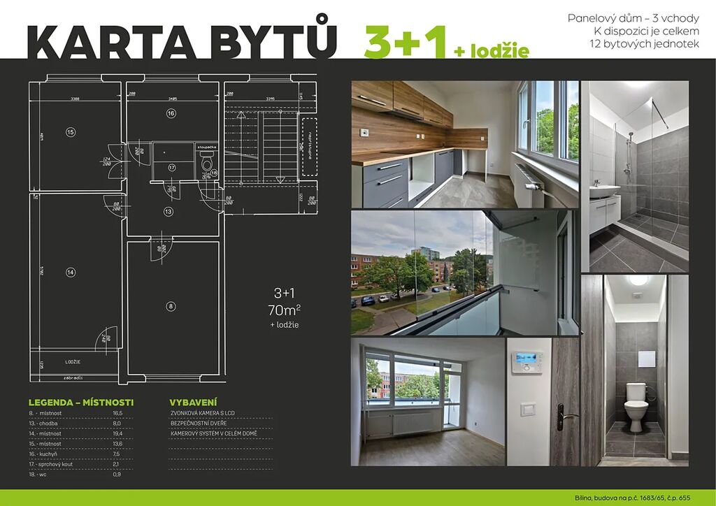 Nabízíme k prodeji investiční příležitost v podobě prodeje – Části nemovitosti (vchod) v ,,Nově zrekonstruovaném Panelovém Domě,, s 12 bytovými jednotkami o velikosti 4 x 3+1, 4 x 2+1 a 4 x 1+1 s celkovou obytnou plochou 636 m2 a s nebytovým prostorem o velikosti 100 m2. Dům i jednotlivé vchody jsou vybaveny nadstandartními prvky: