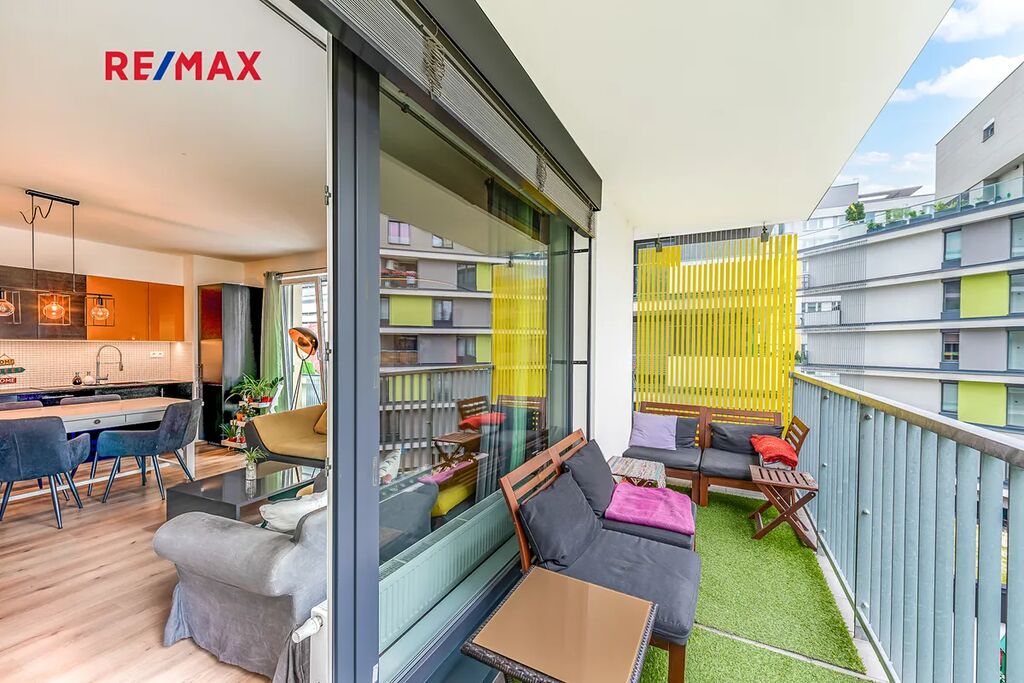 Velký balkon 14 m² přístupný z obývacího pokoje i ložnice – ideální na ranní kávu nebo relax s dětmi.