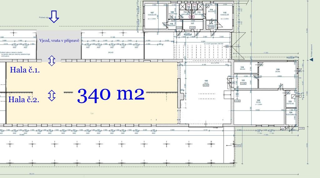 Velikost haly 340 m2 ( zatím konstrukcí dělená na dvě části - lze uvolnit )