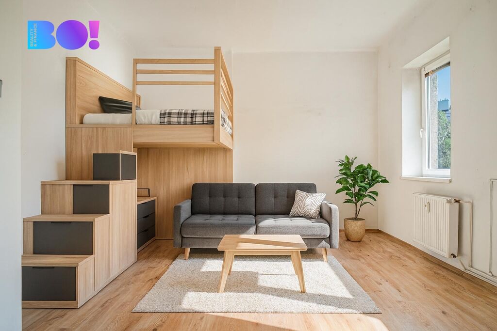Velkou výhodou jsou vysoké stropy, které dávají bytu prostornější charakter a zároveň nabízí možnost kreativního využití – například vybudování praktické ložnice na vyvýšeném patře, jak můžete vidět na vizualizaci mezi fotografiemi.
