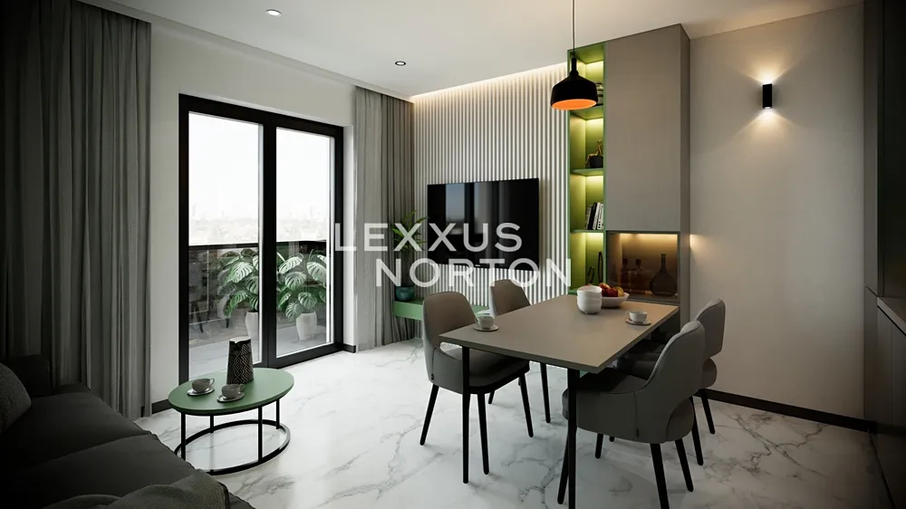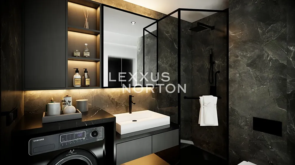 Obývací pokoj s kuchyňským koutem působí vzdušně a poskytuje příjemné místo pro relaxaci. Hlavní ložnice má dostatek prostoru pro šatní skříň a další úložné prvky. Koupelna se sprchovým koutem a WC je zpracována v nadčasovém stylu – stěrka v imitaci kamene a černé baterie Mexen Cube.