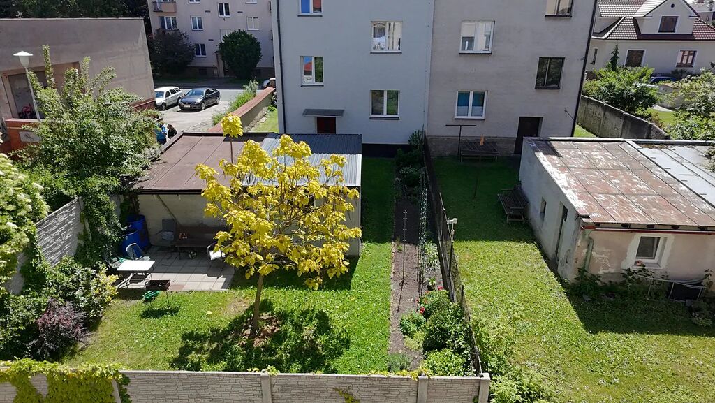 Na oploceném pozemku náležícím k bytovému domu je možnost využít zahradní posezení případně založit zahrádku.