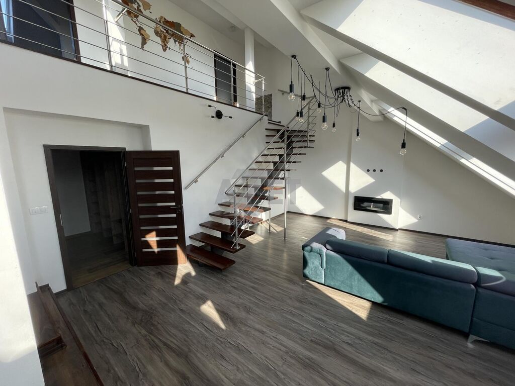 Vstupní chodba disponuje vestavěnou skříní na míru, která poskytuje velkorysý úložný prostor. Hlavní obytná místnost je světlá a vzdušná, s originálním schodištěm vedoucím do podkroví, kde se nacházejí samostatné pokoje vhodné jako ložnice a dětský pokoj. Díky této dispozici je byt velmi variabilní a umožňuje vytvořit si skutečně osobité bydlení podle vlastních potřeb.