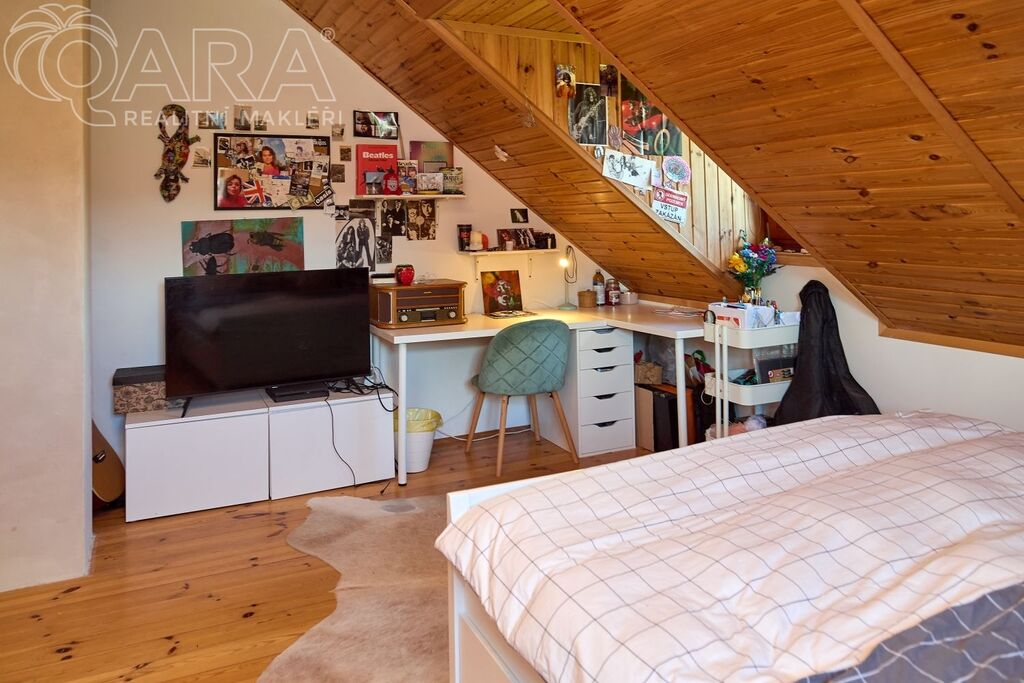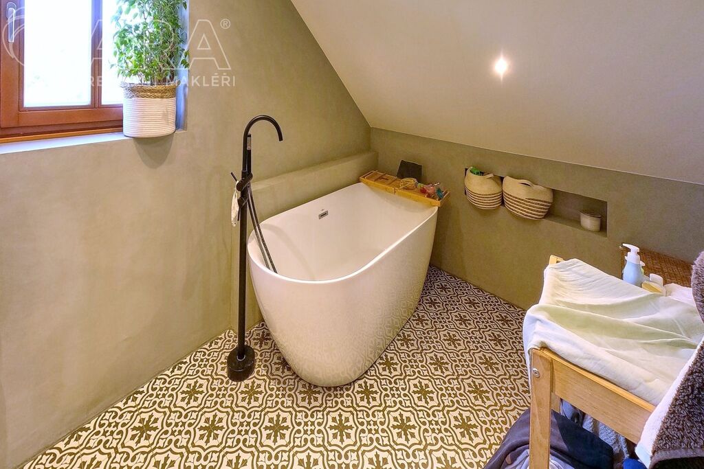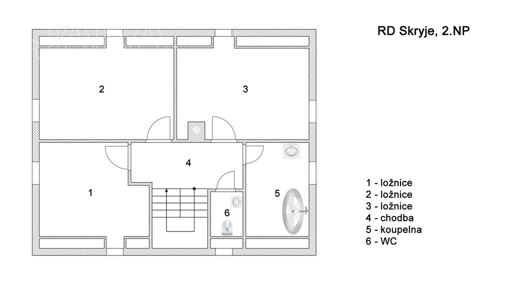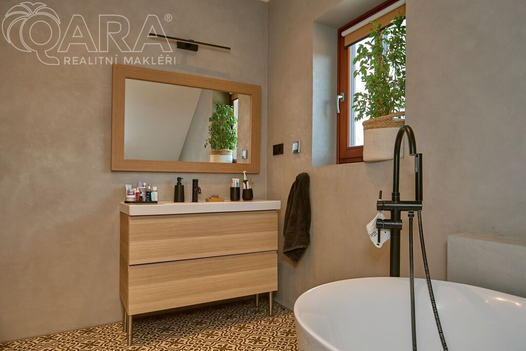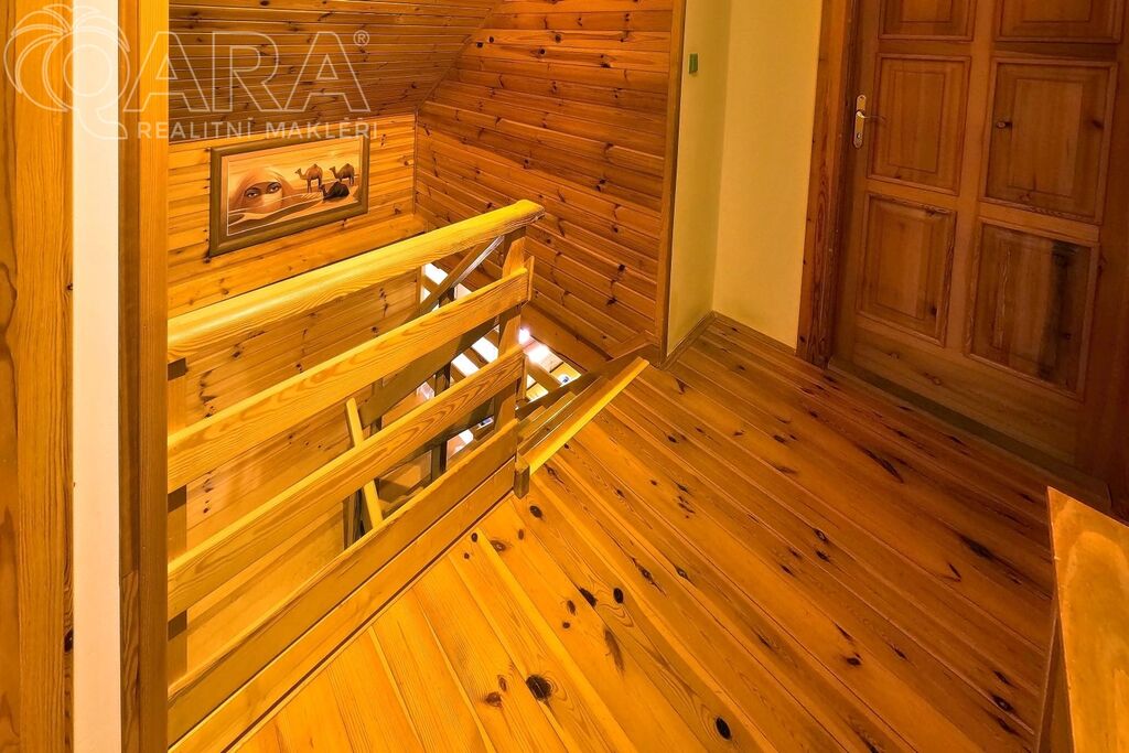Do patra vede dřevěné schodiště a naleznete tu 3 pokoje, moderní koupelnu se samostatně stojící vanou a samostatné WC.