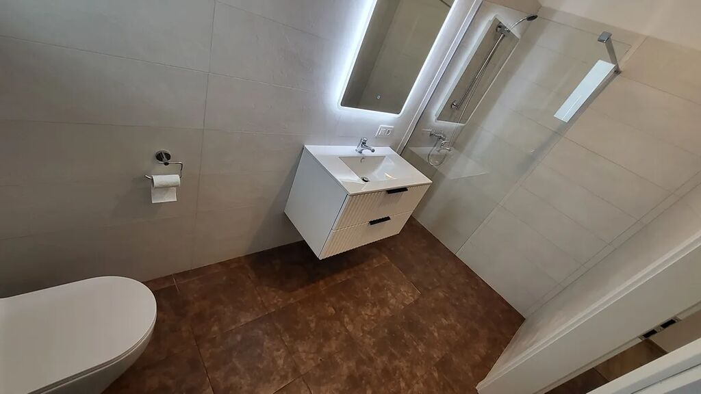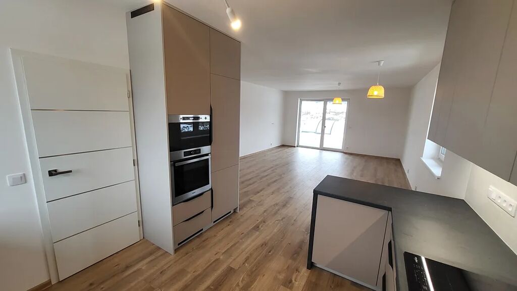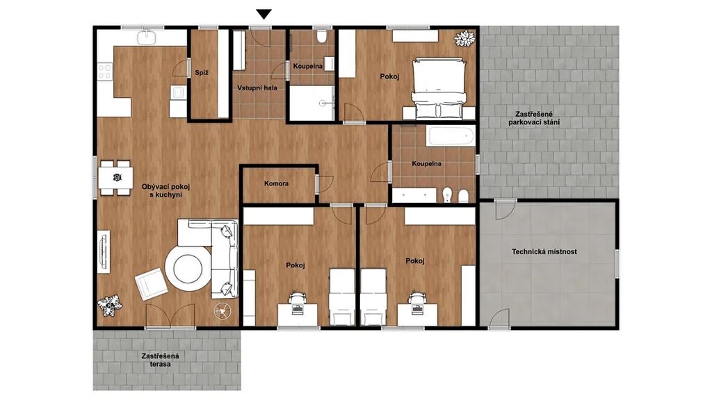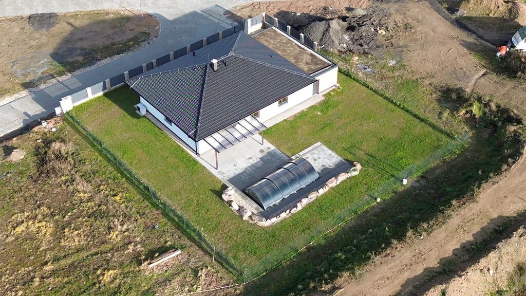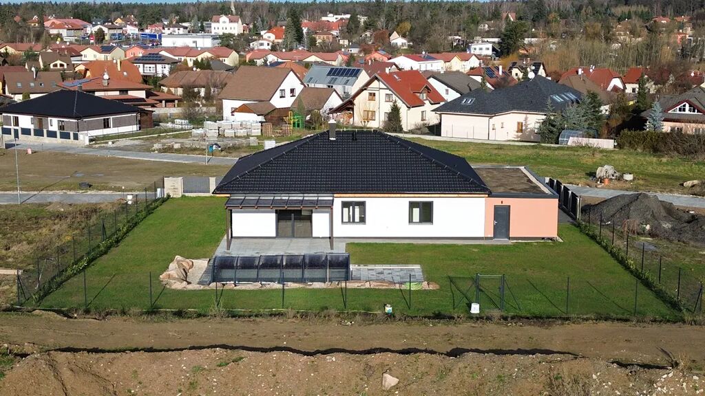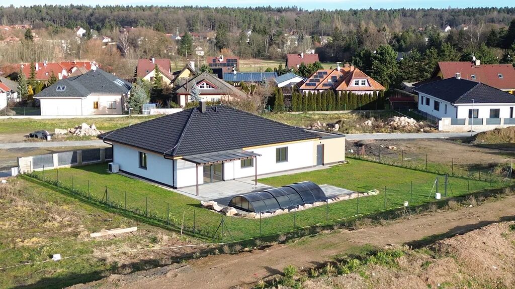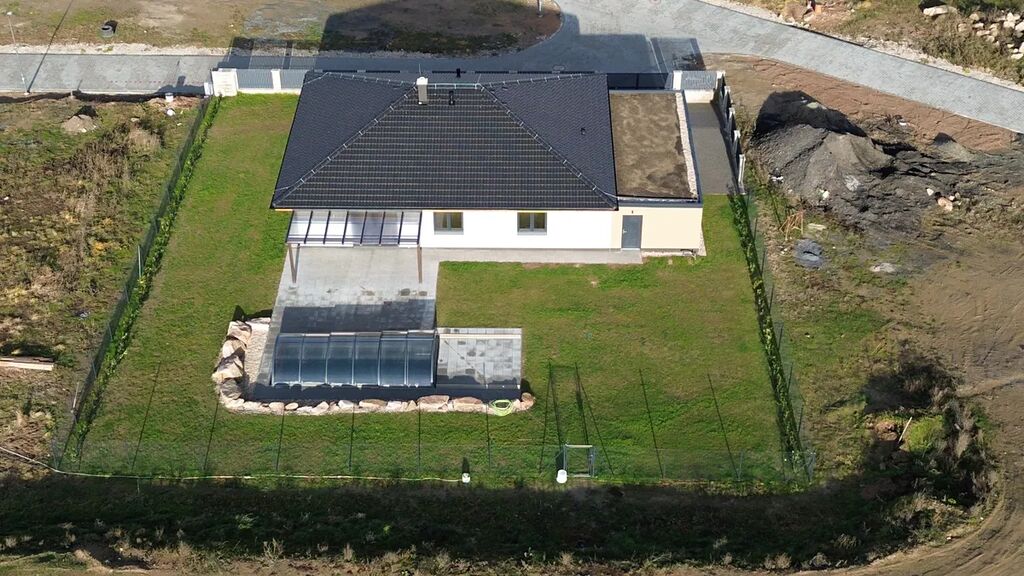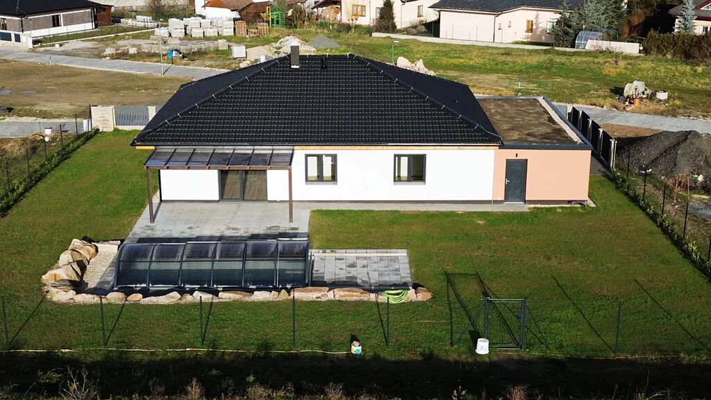 Dům je řešený jako 4+kk, zastavěná plocha je 184 m2, užitná 147 m2 (127 m2 vnitřní plocha domu + 20 m2 technická místnost), celková plocha pozemku včetně domu je 875 m2. Dispozice domu: vstupní hala, velký obývací pokoj s kuchyní (se vstupem na terasu a zahradu k bazénu), komora, tři samostatné pokoje, 2 x koupelna (jedna koupelna s WC a sprchovým koutem, druhá koupelna s WC a vanou), technická místnost s technologií tepelného čerpadla (vzduch - voda) a úložný prostor na půdě. U domu je samostatná technická místnost se vstupem ze zahrady a parkovací stání pod střechou. Na domě jsou předokenní žaluzie s ovládáním přes wifi.
