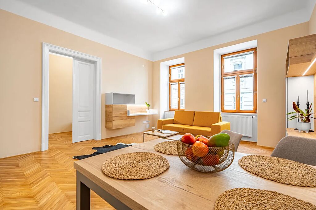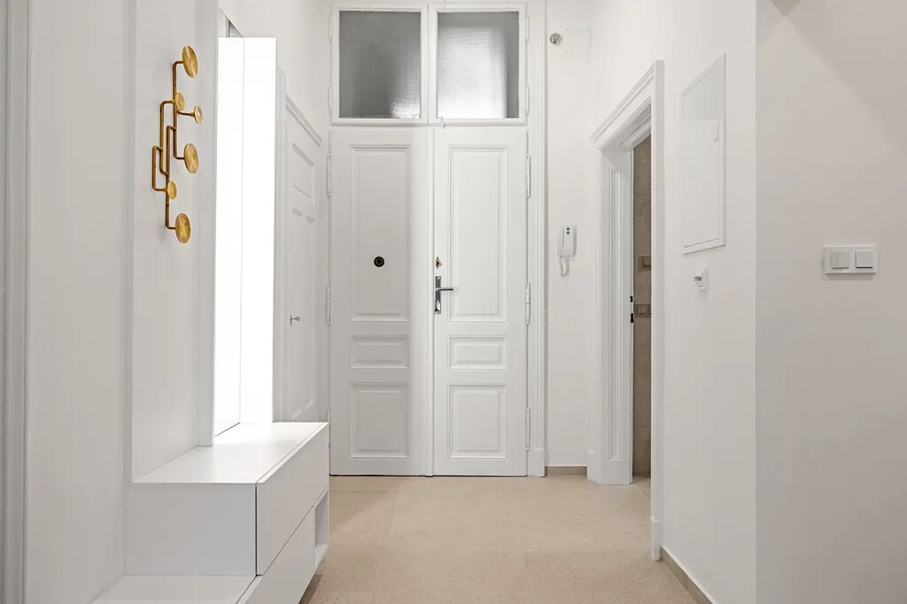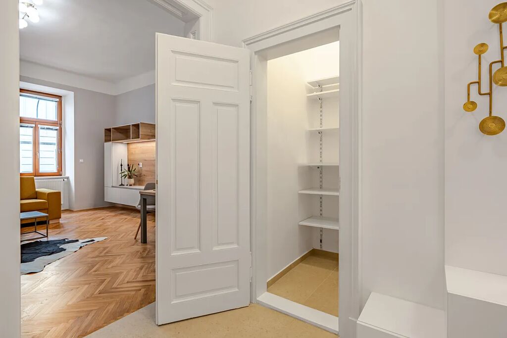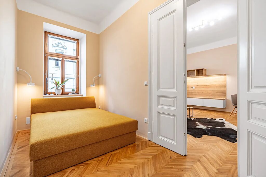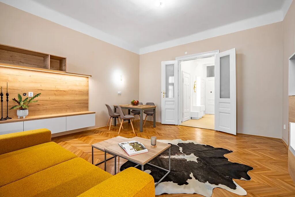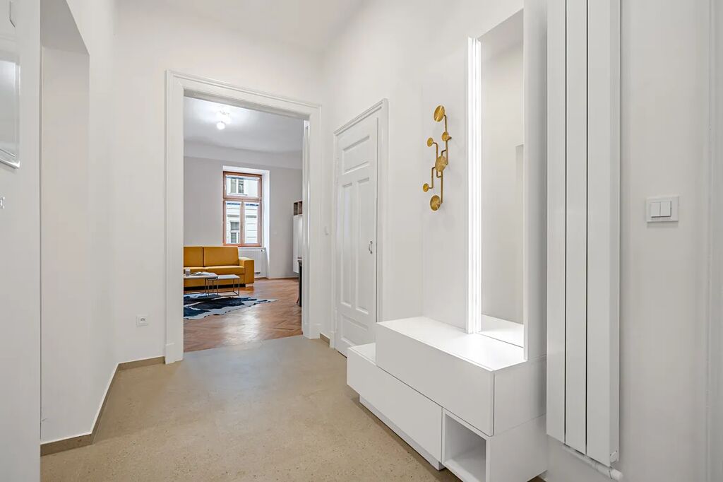 Byt je vyladěn do posledního detailu a má prvky, které si zamilujete – dvoukřídlé dveře, vysoké stropy, renovované parkety a ambientní podsvícení nábytku, které dolaďuje už tak dokonalou atmosféru.