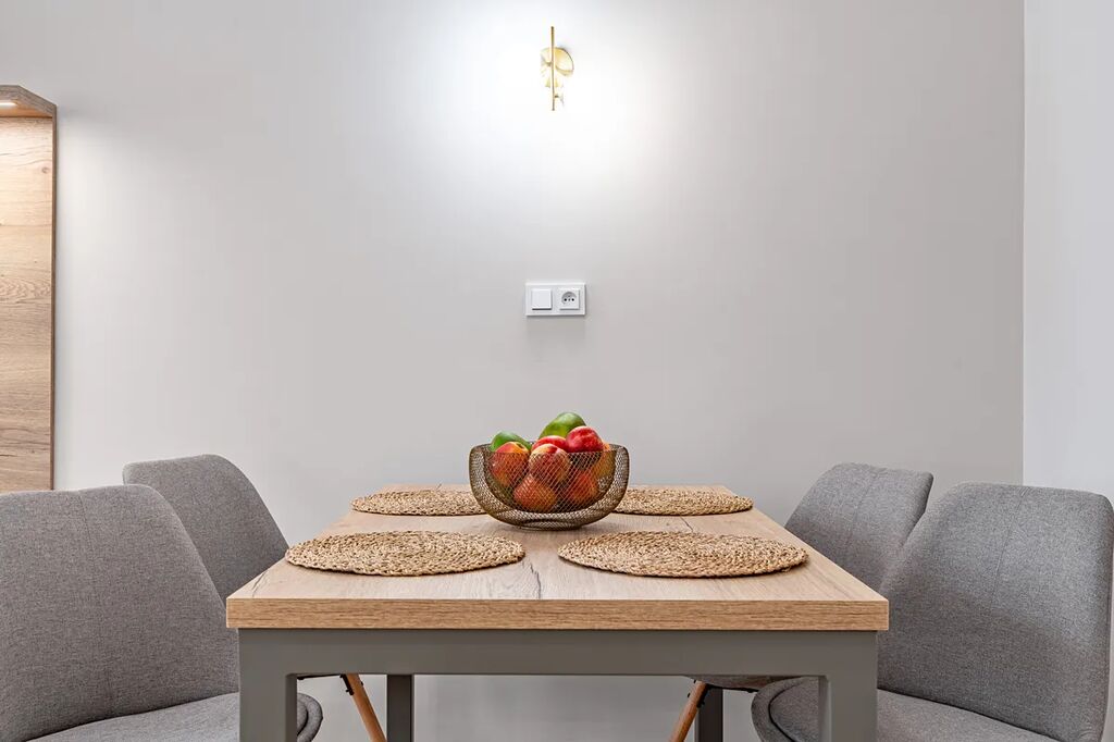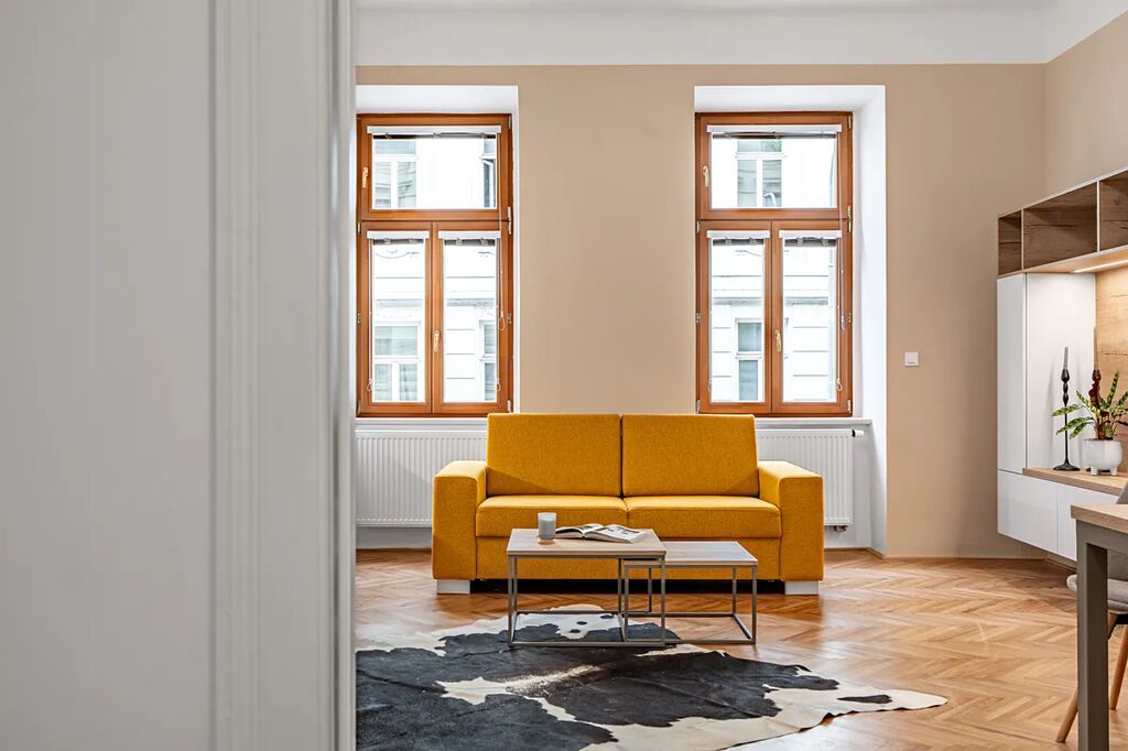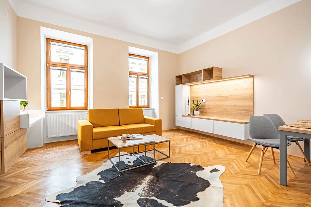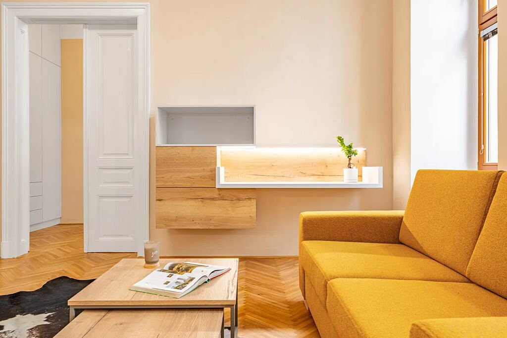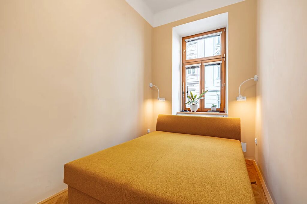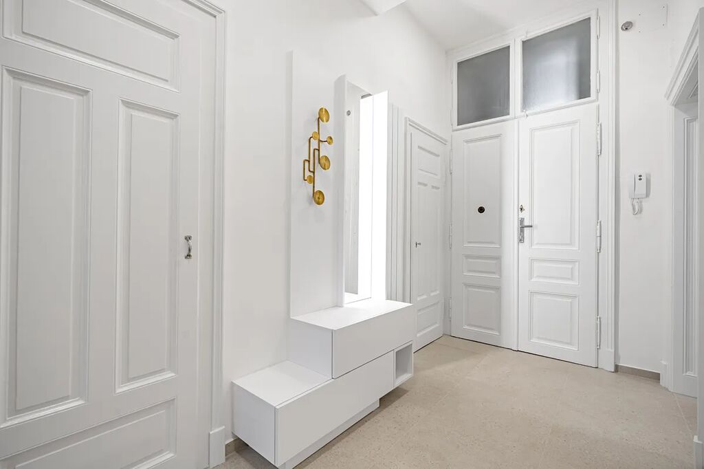 Byt je vyladěn do posledního detailu a má prvky, které si zamilujete – dvoukřídlé dveře, vysoké stropy, renovované parkety a ambientní podsvícení nábytku, které dolaďuje už tak dokonalou atmosféru.