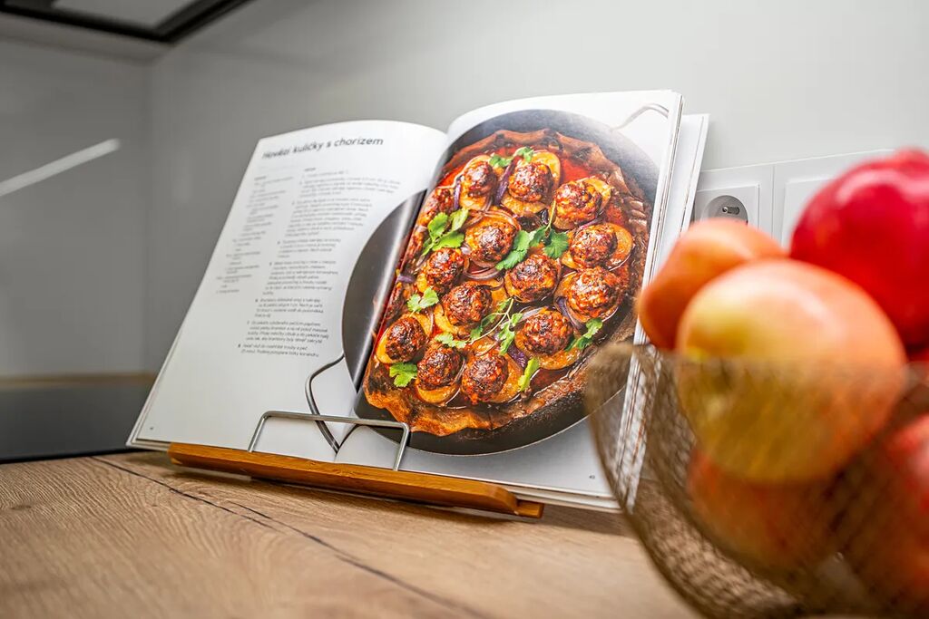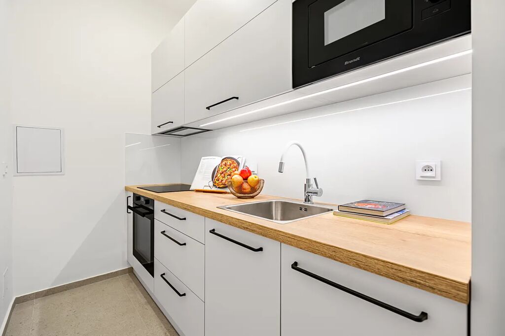 • plně vybavenou luxusní kuchyňskou linku (indukční deska, trouba, myčka, lednice, mrazák)